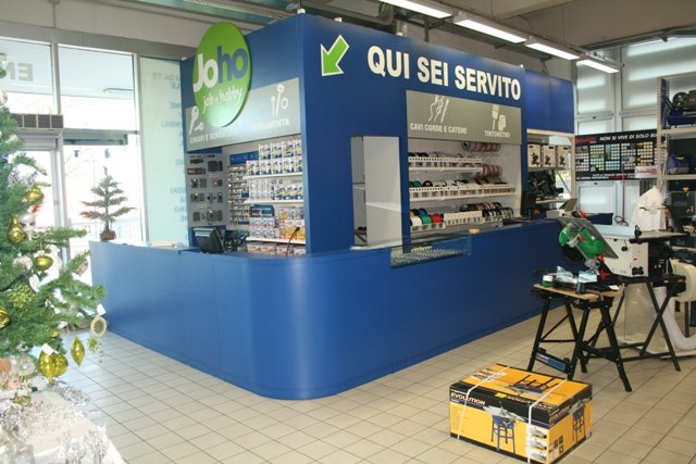 Come è caratteristica dei negozi JOHO, il cuore del punto vendita è il Bancone Servizi che il cliente incontra subito entrando sulla sinistra. I Bancone Servizi accoglie la clientela che desidera avere una consulenza e fornisce i servizi di duplicazione chiavi, il tintometro, e l'acquisto di corde, catene e cavi elettrici al metro.