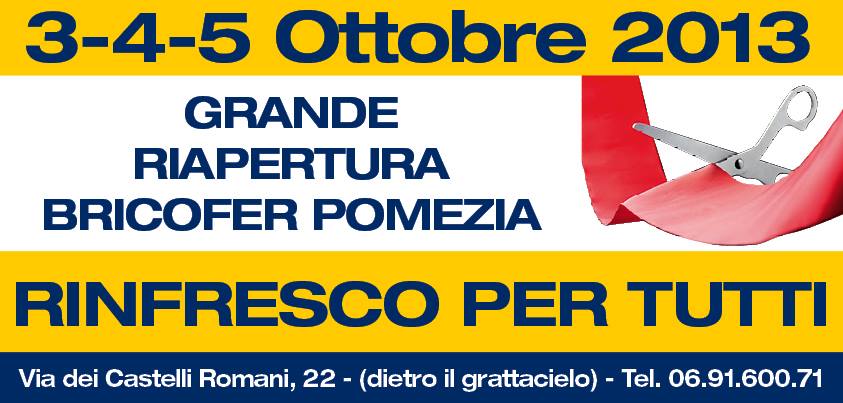 Tre giorni di festeggiamenti per la riapertura del punto vendita Bricofer a Pomezia (RM) con una superficie ampliata di 1.000 metri quadrati per offrire molta più scelta ai clienti. Molti prodotti sono offerti sottoscosto fino al 12 ottobre e tutti da scoprire sono il nuovo settore edilizia, la nuova area garden, il reparto decorazione, il termoidraulico. I servizi offerti sono: duplicazione chiavi, tintometro, taglio legno gratuito, rimborso differenza.