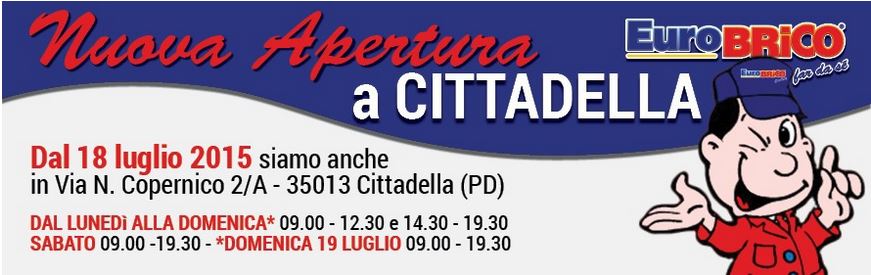 Da sabato 18 luglio sarà attivo il 27° punto vendita Eurobrico, che si trova a Cittadella (PD). Si tratta di un centro che si sviluppa su una superficie complessiva di 2.500 metri quadrati e che propone molteplici servizi: vantaggiose formule di pagamenti rateali, finanziamenti, consegne effettuate anche a domicilio, montaggio, servizi espressi di taglio legno, bordatura pannelli, confezionamento cornici, affilatura coltelli e forbici, duplicazione chiavi e telecomandi, centro ricarica gas e servizio tintometrico. Servizi, qualità dei prodotti e prezzi interessanti aspettano tutti i clienti che si recheranno nel nuovissimo punto vendita Eurobrico a Cittadella.
