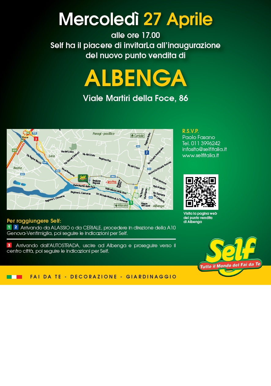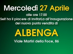 Sarà inaugurato ad Albenga (SV), il prossimo 27 aprile alle 17:00, il trentesimo punto vendita dell'insegna piemontese Self. Il negozio è in via Martiri della Foce, 86. Nei prossimi giorni vi terremo aggiornati sull'inaugurazione e pubblicheremo le immagini del nuovo punto vendita.