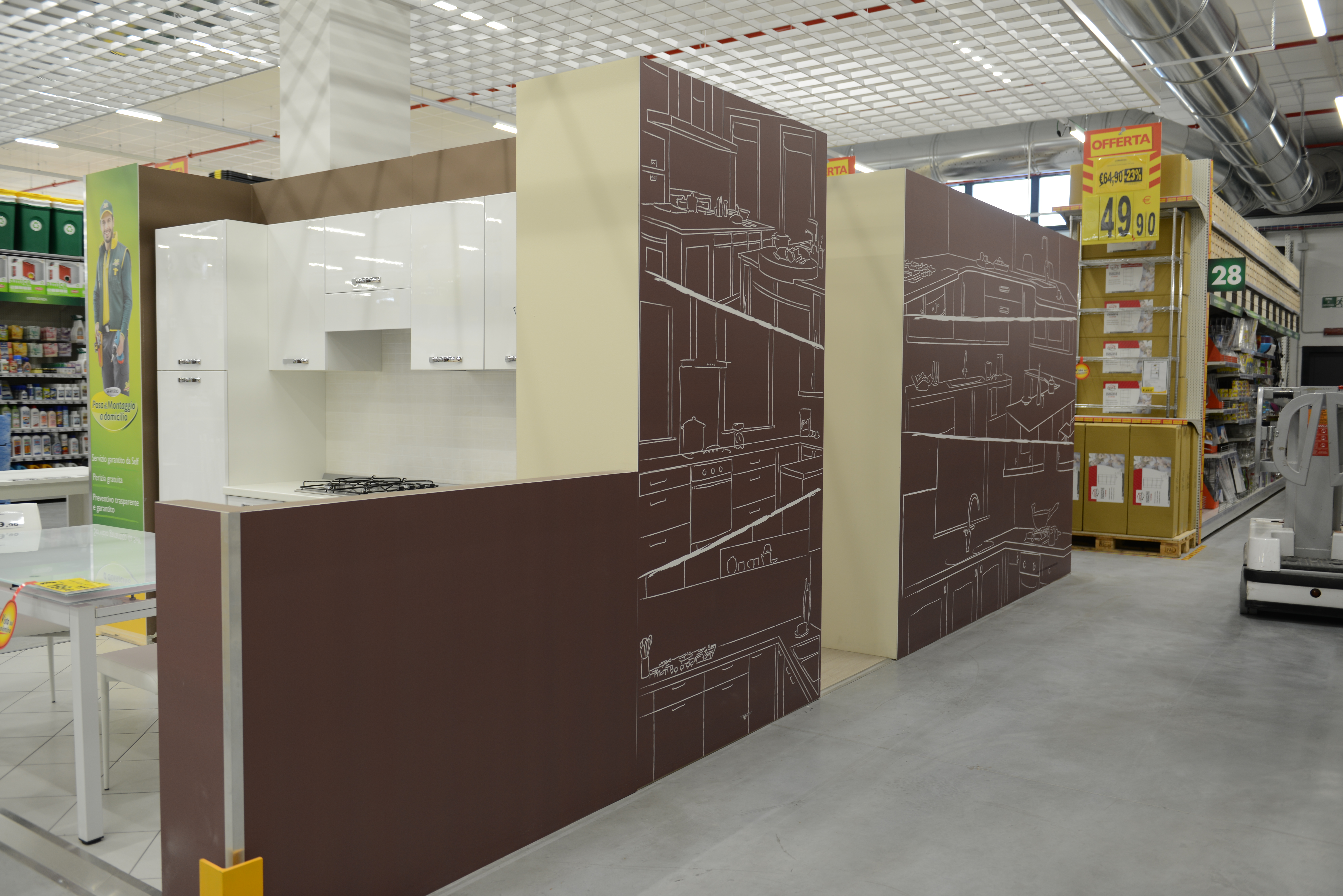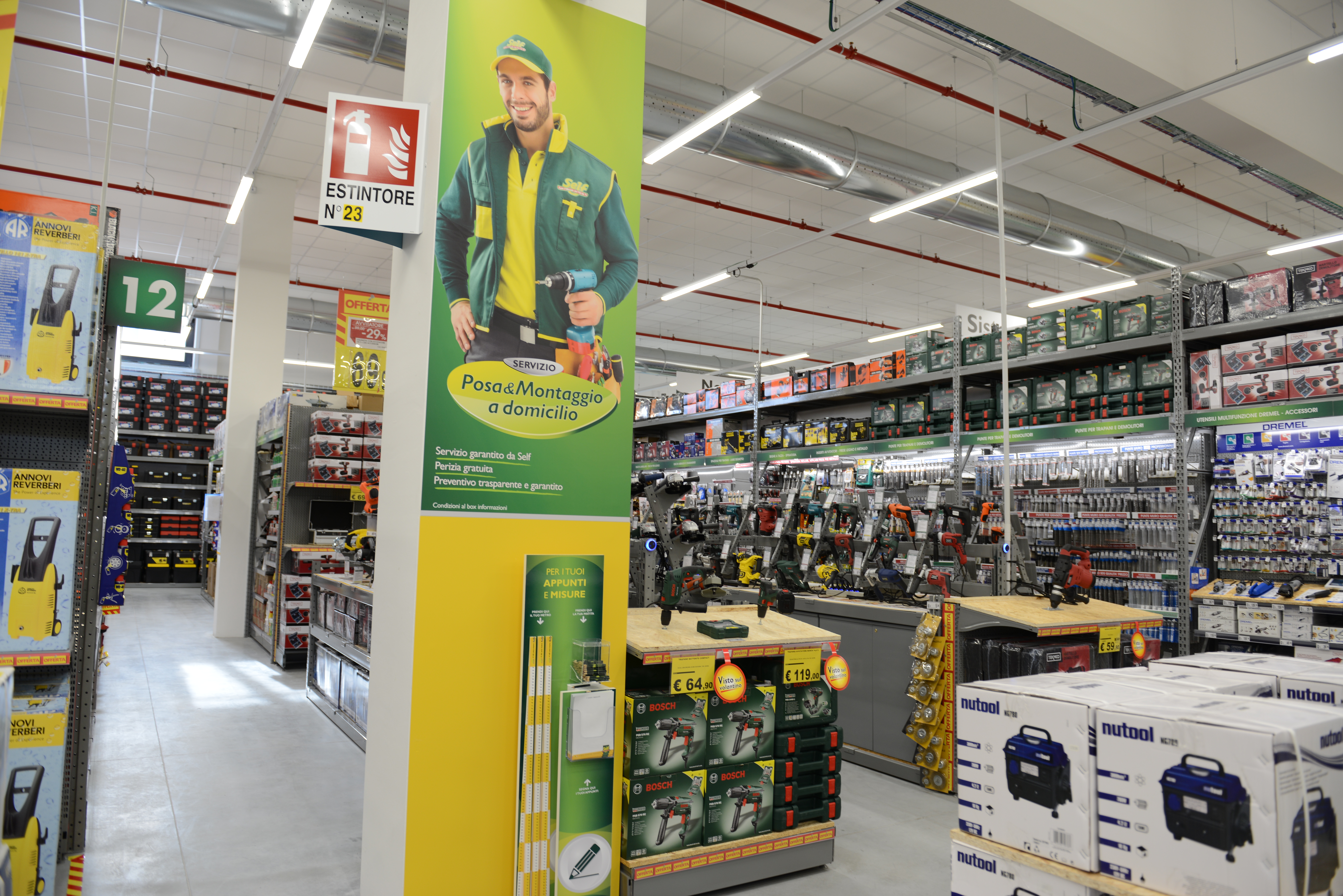 Nel nuovo punto vendita Self sono previsti vasti assortimenti in tutti i reparti. Tante le novità per il giardinaggio, con l’esposizione degli utensili a motore e una nuova gamma di prodotti per la cura del prato; le vernici, con tutto il necessario per gli effetti decorativi, il rinnovo o recupero di mobili e pavimenti e i sanificanti da interno; l’arredo bagno, con una vasta gamma di soluzioni, dal prodotto di arredo al progetto per la realizzazione di un bagno completo. Da segnalare la possibilità di acquisto su ordinazione di serramenti in PVC ad alta prestazione energetica nel settore porte e serramenti. Nel reparto edilizia ci sono prodotti con posizionamento “prezzo ingrosso”, volumi elevati di materiale immediatamente disponibile, promozioni su acquisti di bancali e un vasto assortimento di prodotti necessari per i lavori di edilizia leggera; il reparto sistemazione e mobili con nuovi assortimenti di accessori per la cucina e la pulizia della casa; il settore illuminazione interna ed esterna, con le nuove sospensioni, plafoniere e una vasta offerta di faretti. Vasto assortimento anche nei reparti utensileria, ferramenta, elettricità tecnica e idraulica.