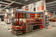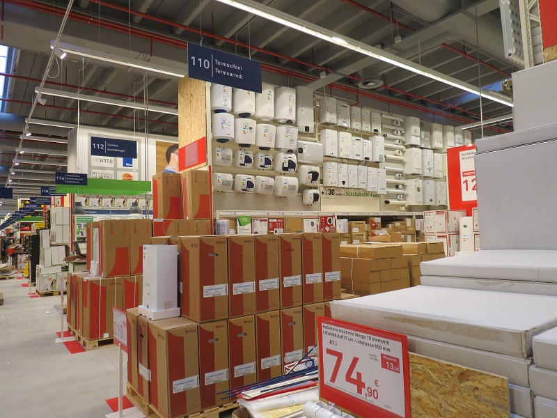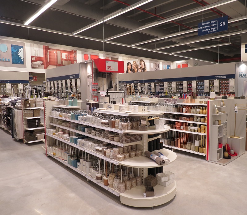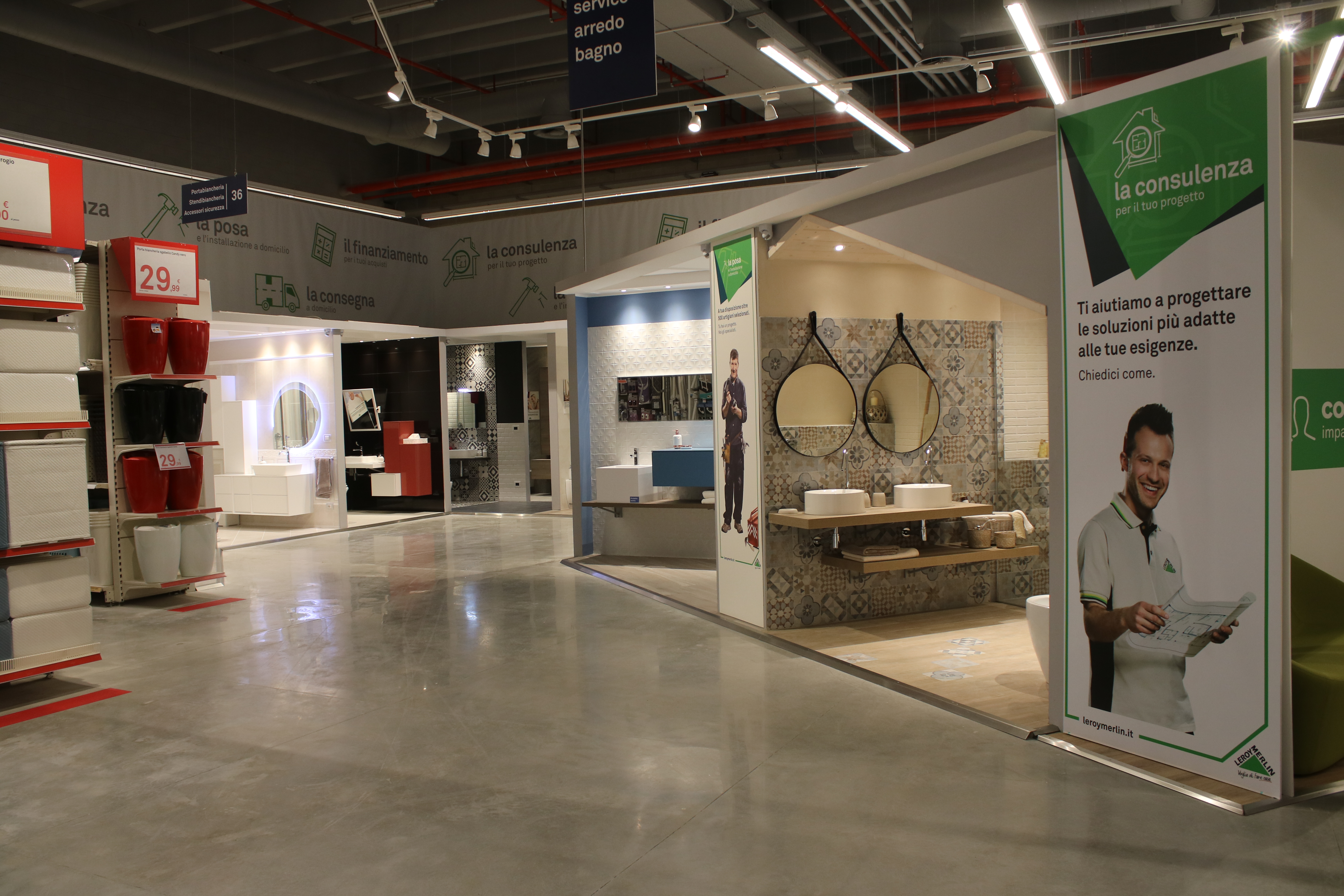 A partire dall’ingresso che offre due percorsi differenziati per i clienti: sulla destra il “mondo tecnico” (ferramenta, utensilerie, cantiene idraulico ed elettrico, edilizia) per un acquisto più veloce in linea con le esigenze degli artigiani e sulla sinistra il “mondo decorativo” per un percorso di acquisto più lento, a caccia di stimoli o – come dicono in Leroy Merlin – desiderosi di realizzare un progetto. Il “mondo decorativo” si snoda così nei reparti vernici, decor e illuminazione, per accompagnare il visitatore nell’area dedicata ai progetti: cioè bagni, cucine, pavimenti, rivestimenti, porte e finestre.