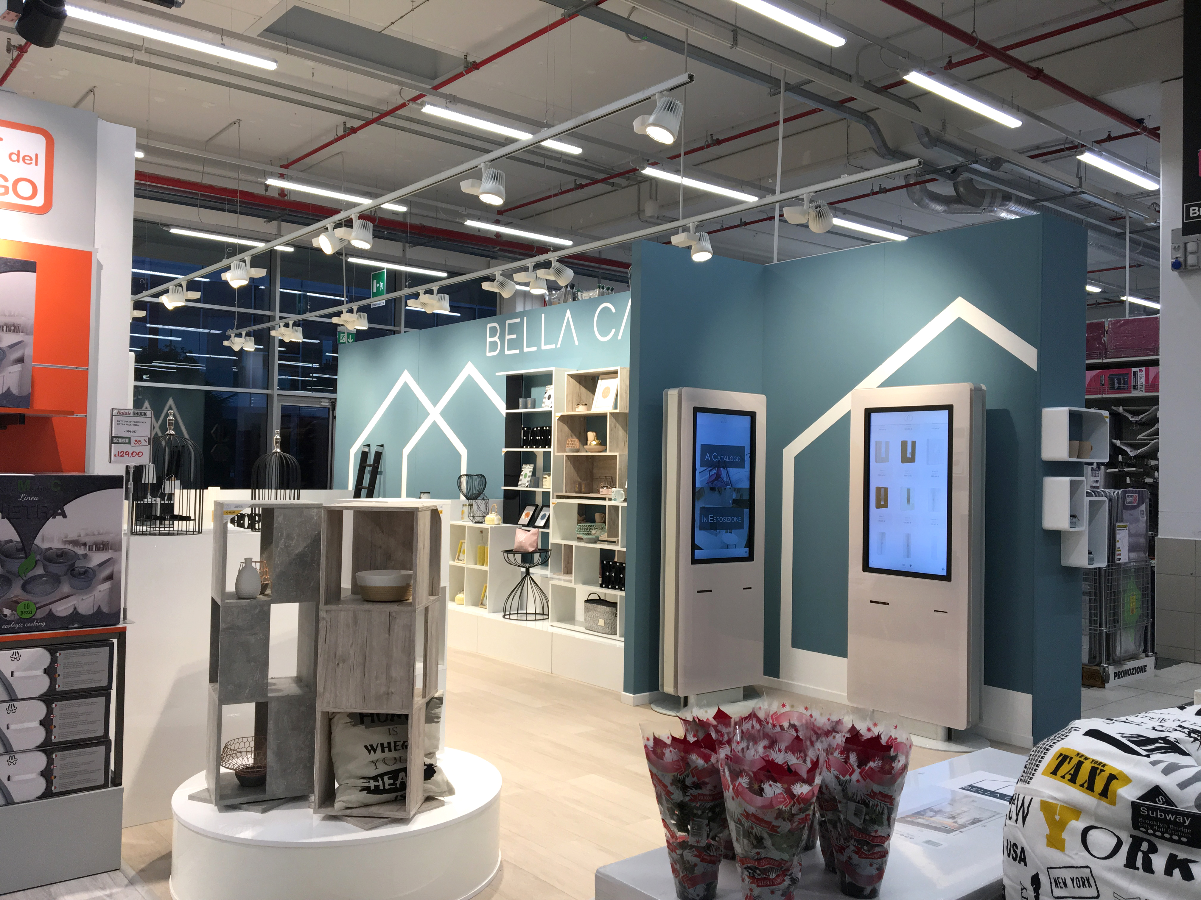 Nel negozio di Bergamo è stato allestito il nuovo corner “Bella Casa” dedicato al settore arredo, realizzato in collaborazione con “13 casa”, un partner con una forte competenza nella vendita online e organizzato per la consegna a domicilio. Il corner lega due differenti esperienze d’acquisto, quella in negozio e quella online, tramite un sistema di touch screen interattivi denominato “E-Wall” che presenta la gamma completa disponibile, oltre 5.000 articoli che vengono periodicamente rinnovati a seconda della stagione e delle tendenze di mercato. Il cliente ha a disposizione un personal shopper e può consultare il catalogo, scegliere gli articoli di proprio interesse, creare il suo carrello virtuale e procedere con l’acquisto, sia di merce disponibile in negozio sia su ordinazione.