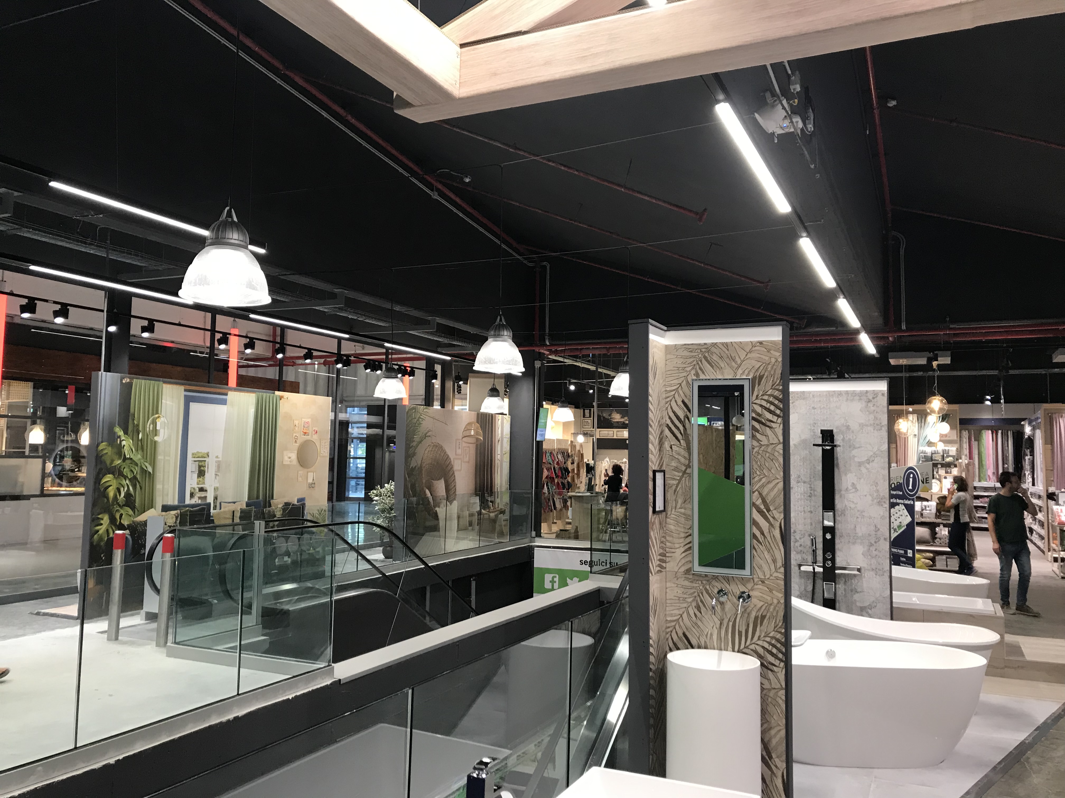 Al piano terra è possibile accedere al negozio da due ingressi. Il primo, più classico, accompagna i clienti in un percorso verso i reparti dal focus più “tecnico” (elettricità e domotica, utensileria, idraulica e ferramenta) a differenza del secondo ingresso, un vero e proprio accesso privilegiato che li accoglie in un ambiente riconducibile agli spazi di una casa grazie a soluzioni espositive di arredo “bagno “e “giardino” che conducono allo showroom.