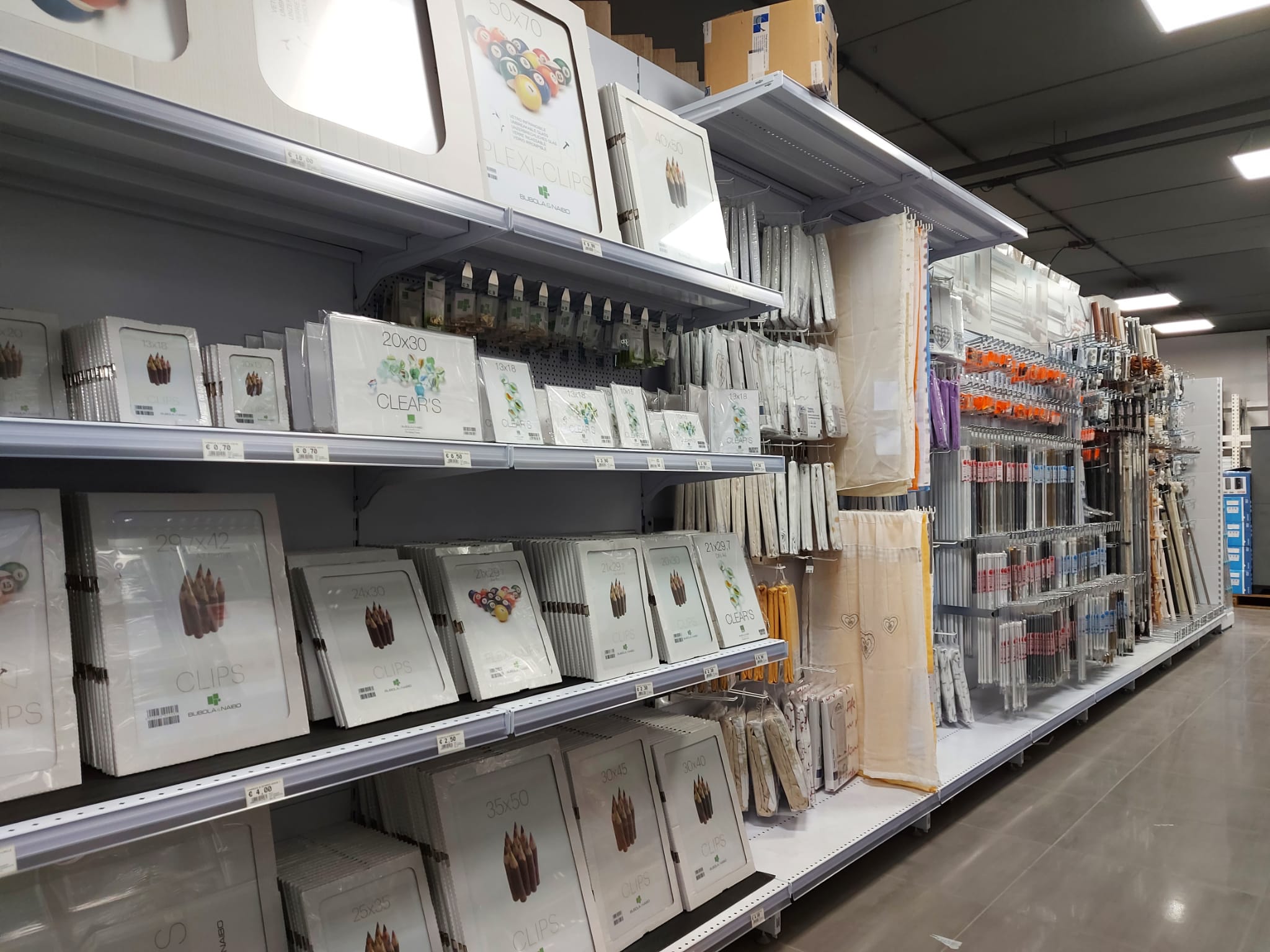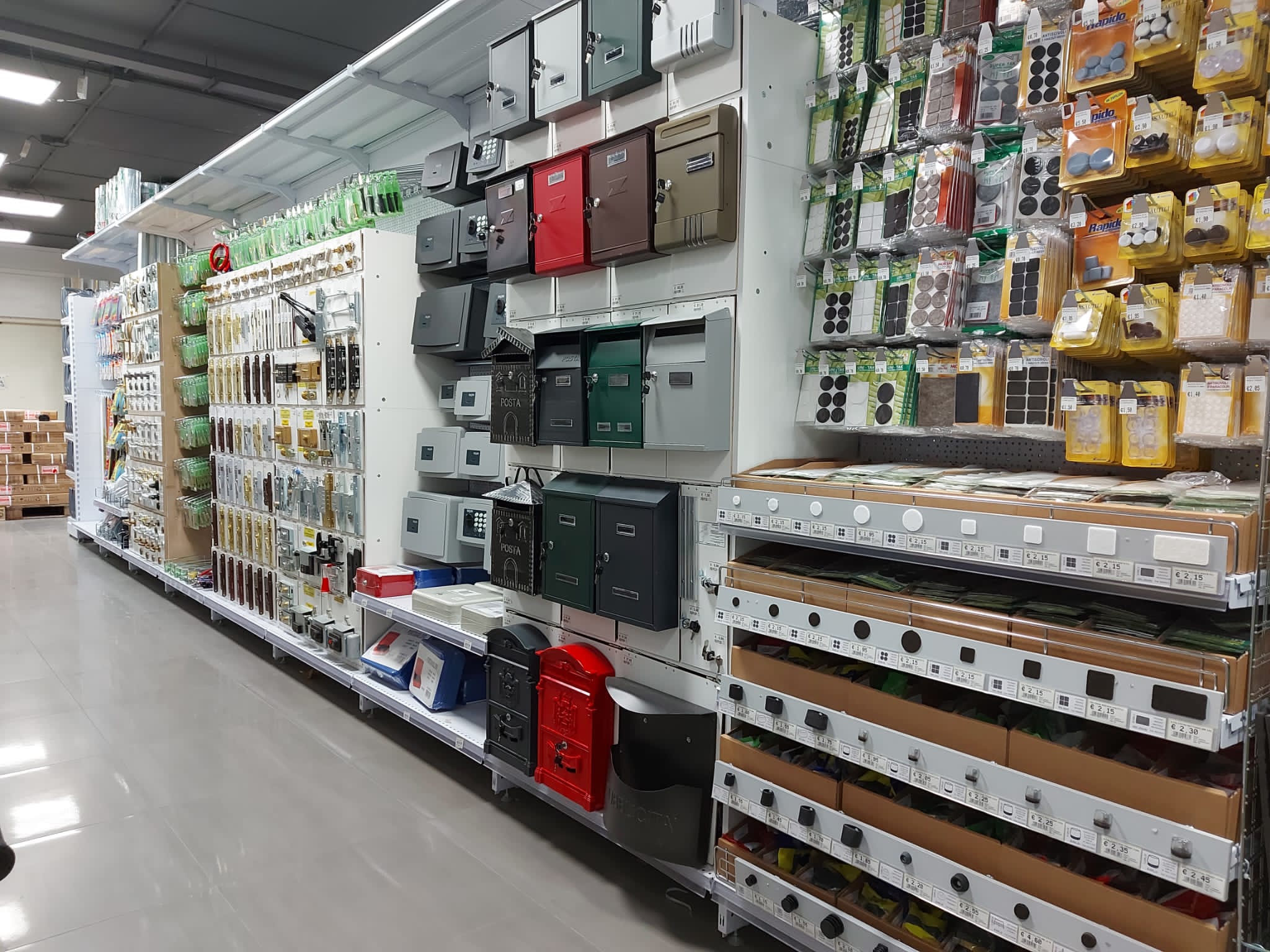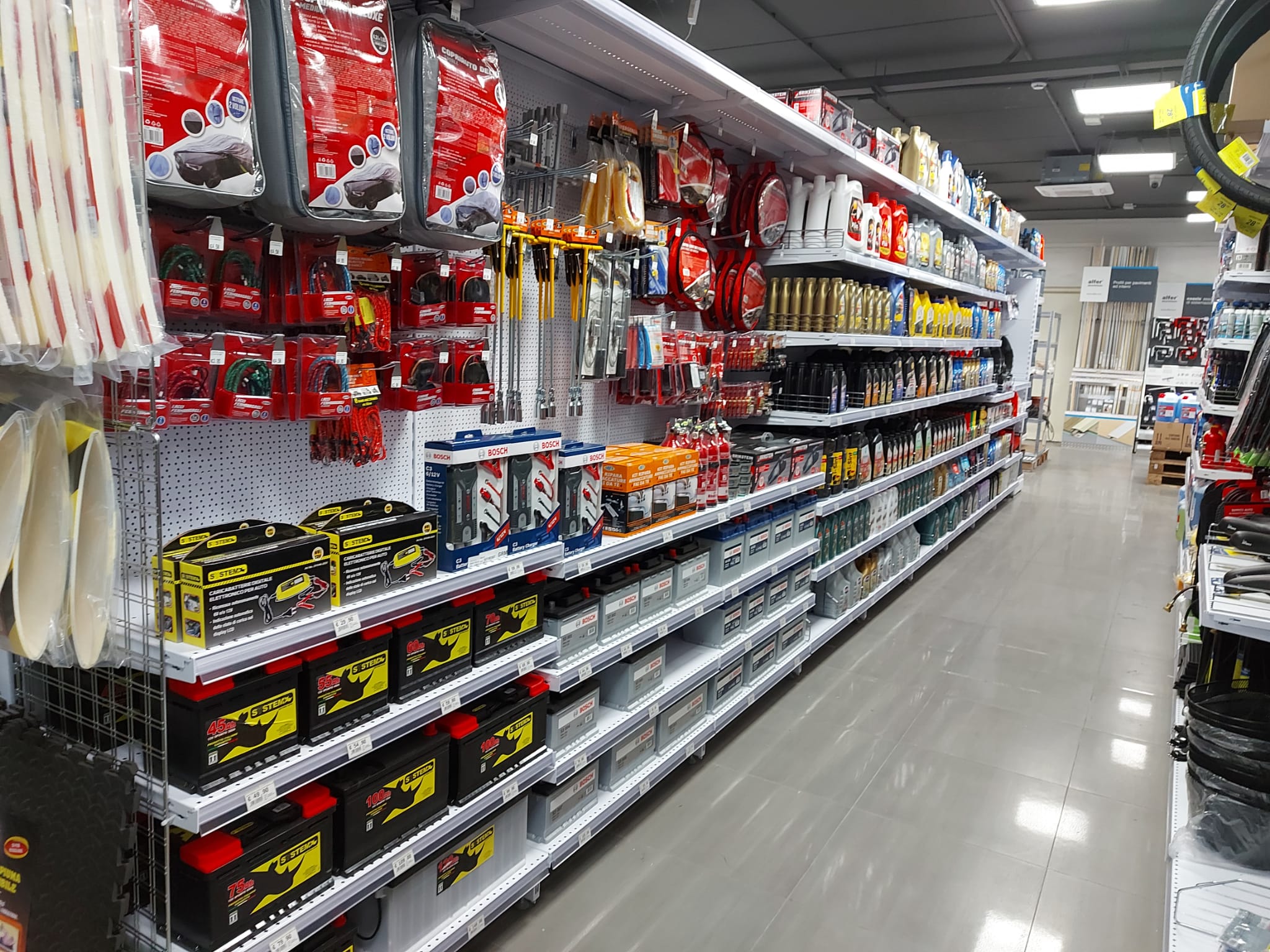 I reparti: ferramenta, utensileria elettrica e manuale, scaffali, decorazione, arredo bagno e accessori, idraulica, vernici e colle, legno, giardinaggio, elettricità e illuminazione, casa, autoaccessori.
