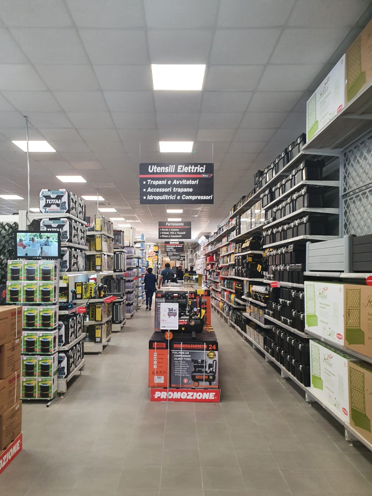 Ferramenta, Utensileria elettrica e manuale, Scaffali, Sistemazione Bagno e accessori, Idraulica, Vernici e colle, Legno, Elettricità, Illuminazione e Giardinaggio con ampia area esterna dedicata all’esposizione dei mobili da giardino.