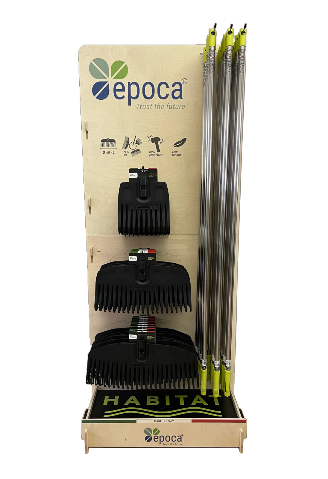 Epoca, azienda italiana tra i leader nel segmento Garden, presenta i nuovi rastrelli raccogli foglie della linea Habitat. Prodotti con materiali tecnicamente avanzati e progettati per ottenere la massima resa e ridurre la fatica. La gamma si presenta con un unico manico, in lega di alluminio elettro-saldato leggero e ad alta resistenza (160 cm), e tre rastrelli di diverse misure, utilizzati sia in spazi ampi sia in piccoli giardini, facilmente intercambiabili grazie all'attacco sicuro e rapido "Easy-Fit". Sono disponibili in tre misure Small - Medium – Large.