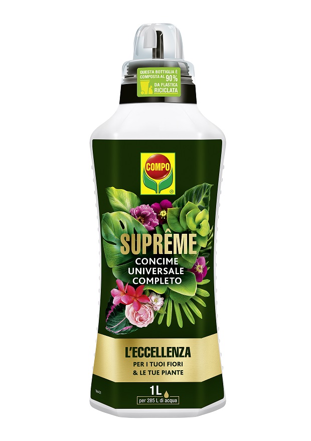 Compo Italia ogni anno propone novità e l’offerta dei concimi liquidi si arricchisce con una grande novità: Suprême, l’eccellenza. Un concime universale completo con un look elegante e premium, finalizzato a comunicare la superiorità del prodotto. Suprême rappresenta semplicemente il meglio per la cura del proprio angolo verde: migliora la crescita e rende le piante visibilmente più belle e forti, garantendo resistenza e mantenendole sane, grazie a una formula nutritiva innovativa con più magnesio e ferro. È più concentrato rispetto ai concimi convenzionali e consente una rigenerazione veloce della vegetazione a seguito di carenze nutrizionali. Suprême è inoltre caratterizzato da un posizionamento premium che conferisce un valore assoluto all’assortimento. Il colore oro e la grafica raffinata e accattivante lo rendono inoltre altamente visibile a scaffale.