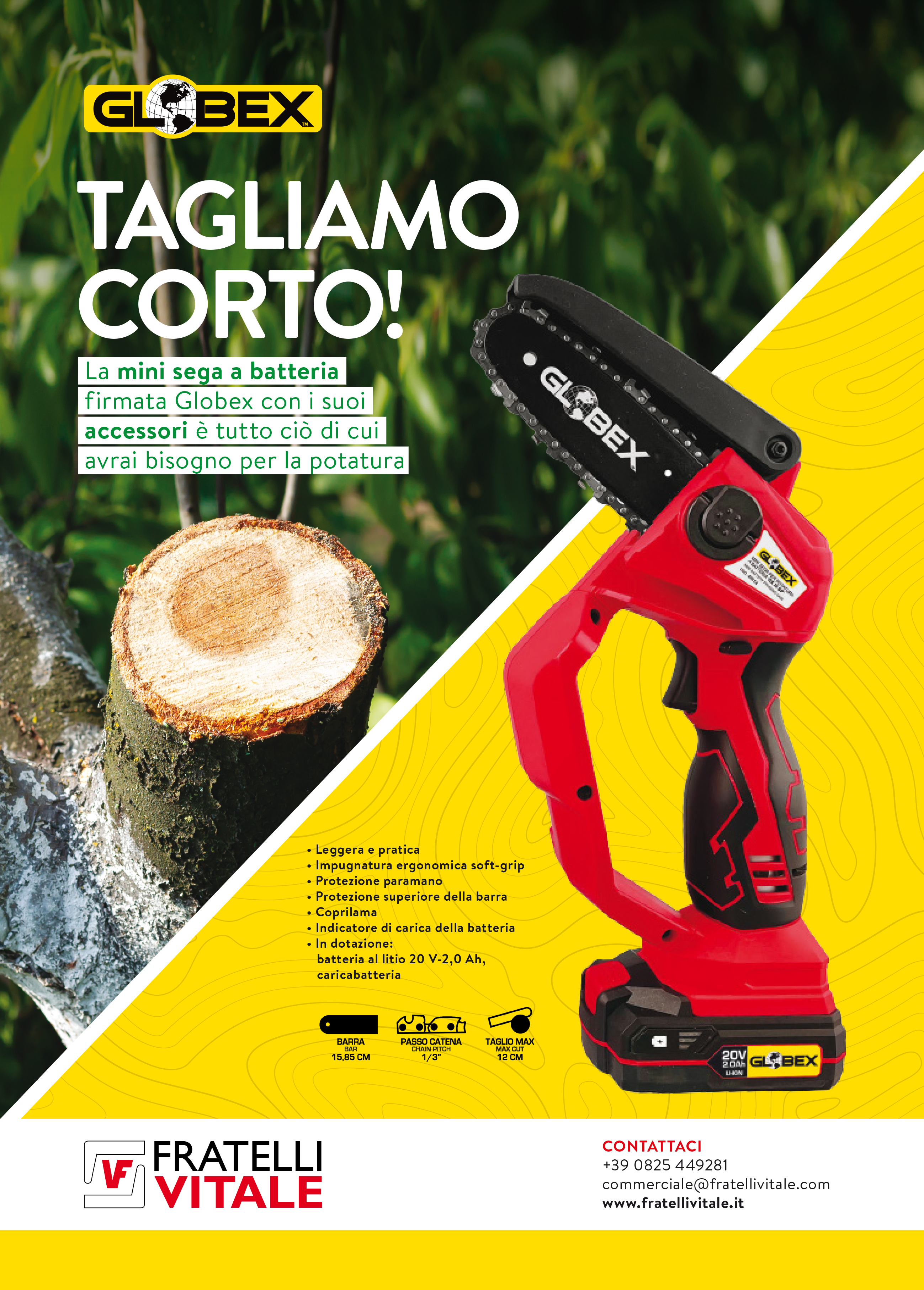 La potatura di giardini, frutteti e vigneti sarà un gioco da ragazzi grazie alla mini sega a batteria Globex.