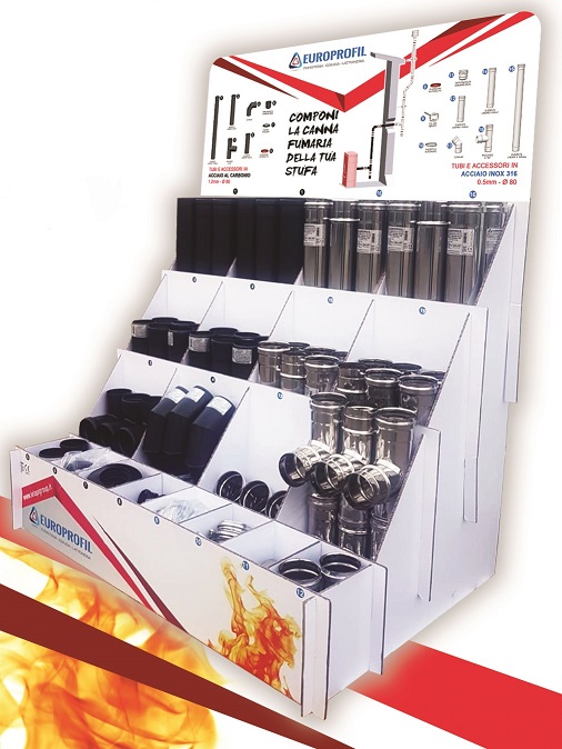 Europrofil conquista la certificazione V2 e dà forma al contenuto, lanciando sul mercato Palbox canna fumaria stufa, un pratico contenitore/espositore in cartone, completo di illustrazioni didattiche per la composizione della canna fumaria della stufa.