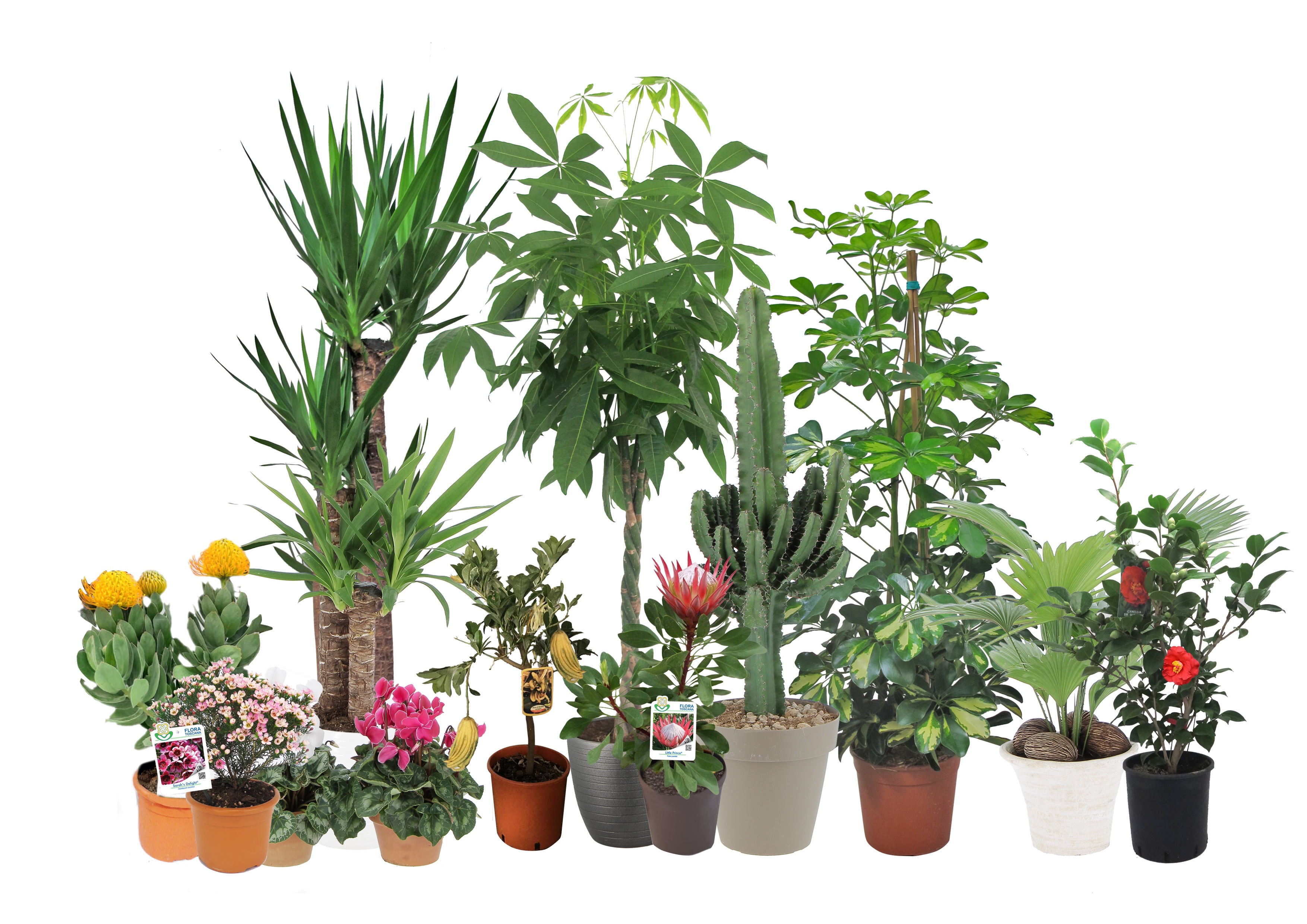 Flora Toscana presenta il proprio assortimento di piante in vaso con molte varietà da interno e da esterno provenienti dagli oltre 100 ettari di produzione dei nostri soci. Particolare importanza rivestono le piante fiorite da balcone o da bordura, annuali e periennali oltre alle piante da appartamento.