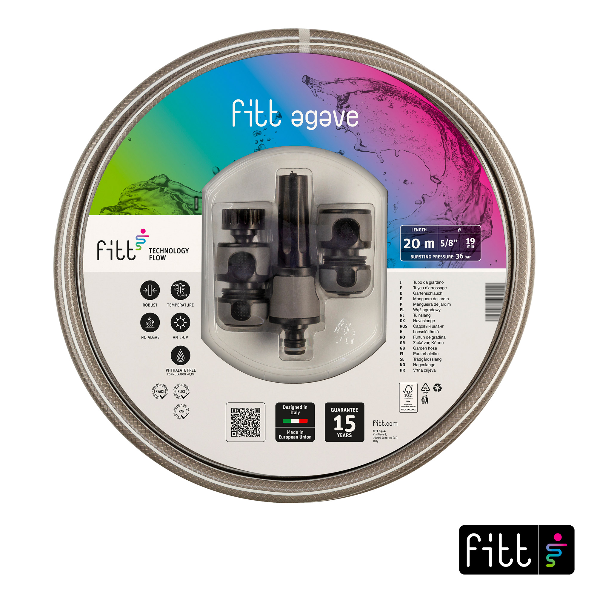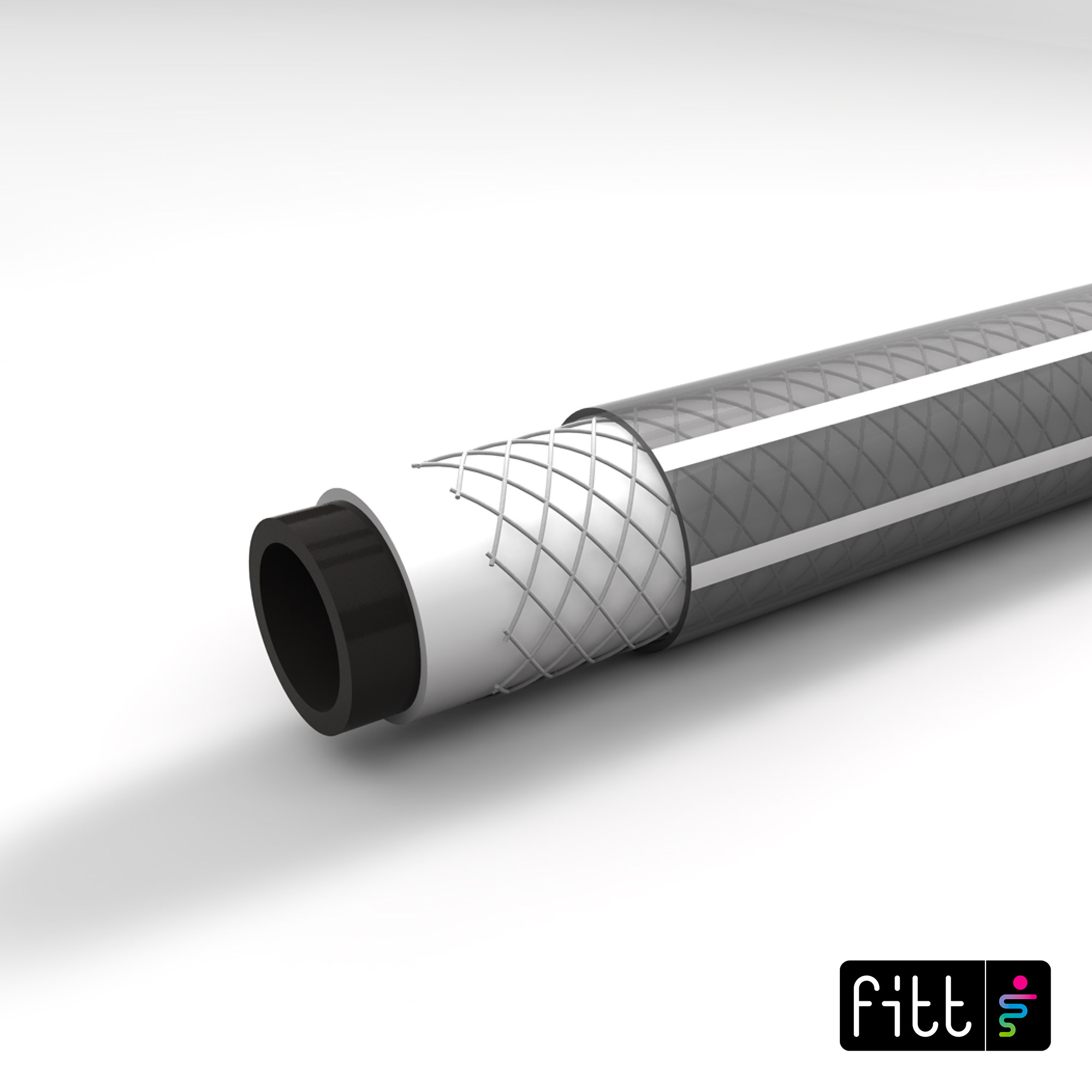 - FITT Agave è il tubo in PVC a 4 strati: allo strato più esterno di colore grigio, si aggiungono il rinforzo tessile retinato che garantisce alta resistenza alla pressione uno strato protettivo di colore bianco e uno strato nero anti-alga.