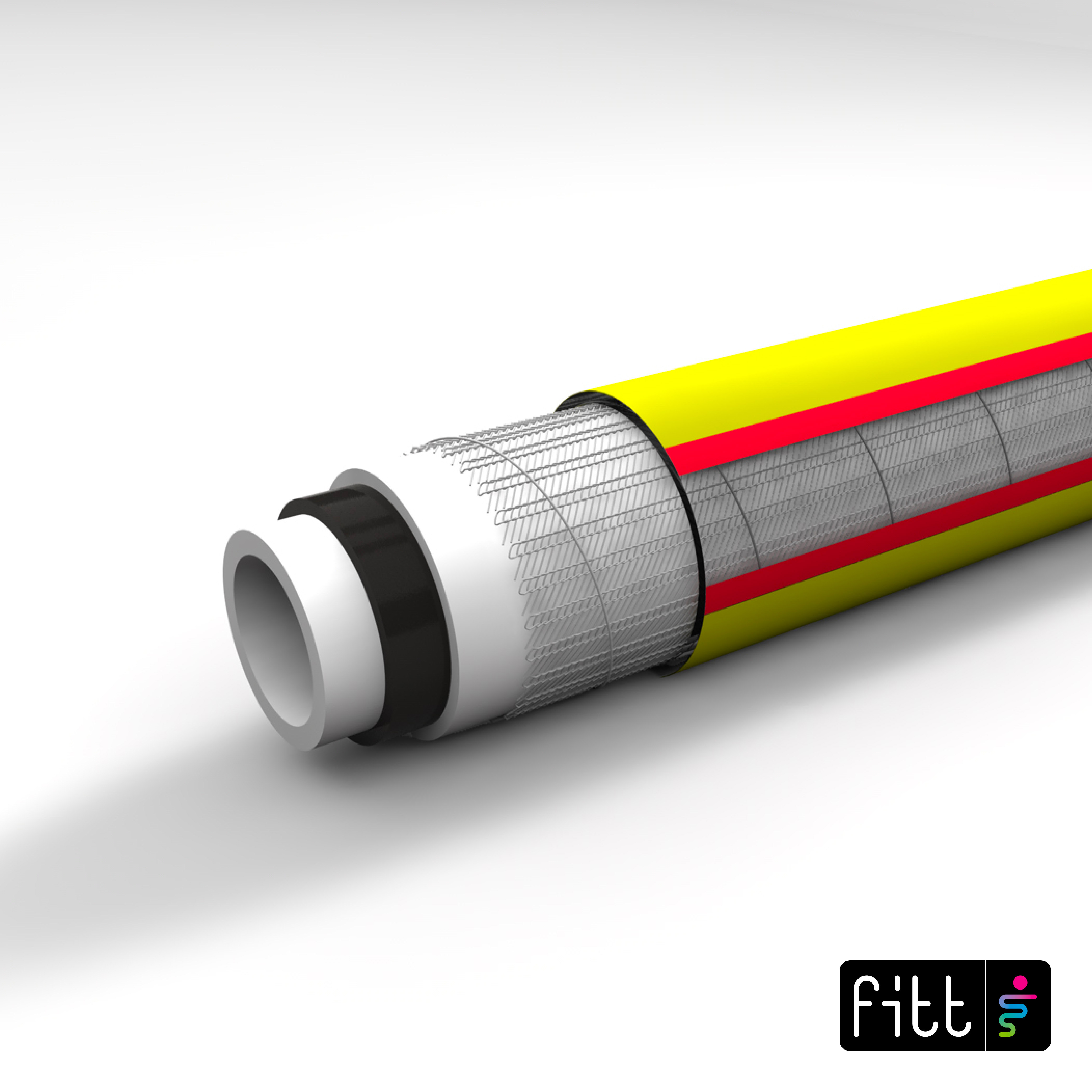 - FITT Flora è il tubo in PVC a 5 strati: allo strato più esterno di colore giallo coprente, si aggiungono il rinforzo tessile magliato con spirale ad alta tenacità, due strati protettivi di colore bianco intervallati da uno strato nero anti-alga.