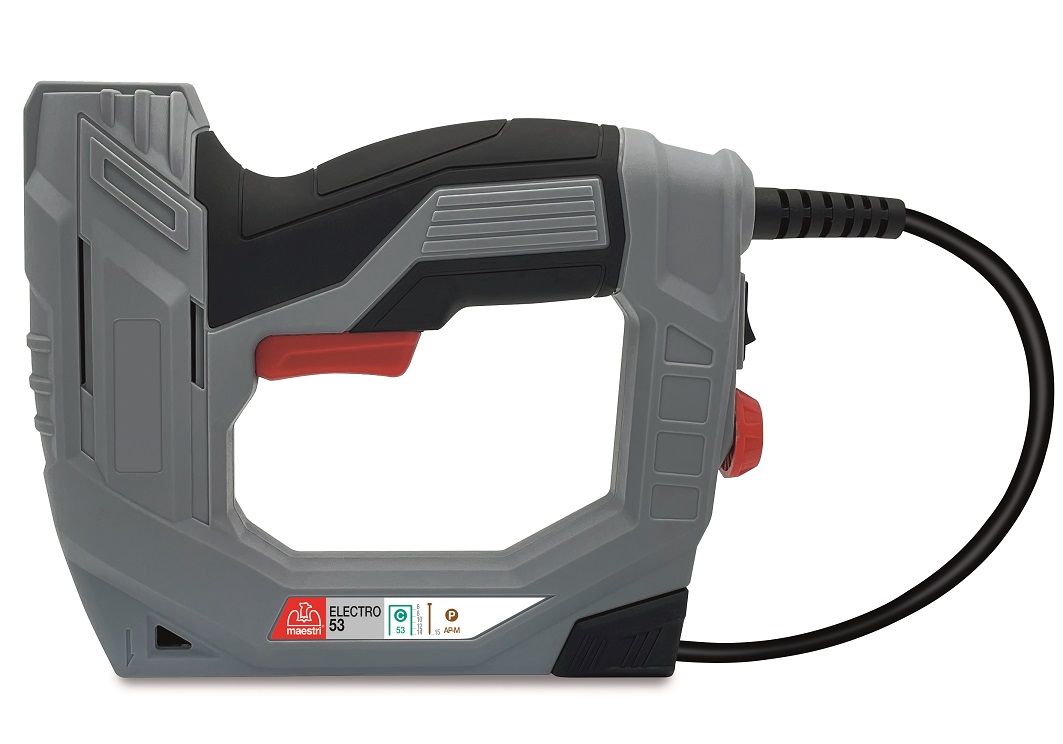 Dal catalogo Romeo Maestri, la fissatrice elettrica Electro 53.14. Veloce, robusta e leggera è ideale per tutte le applicazioni di fissaggio come decorazioni, allestimenti stand, assemblaggi di telai, infissi e tappezzerie.
