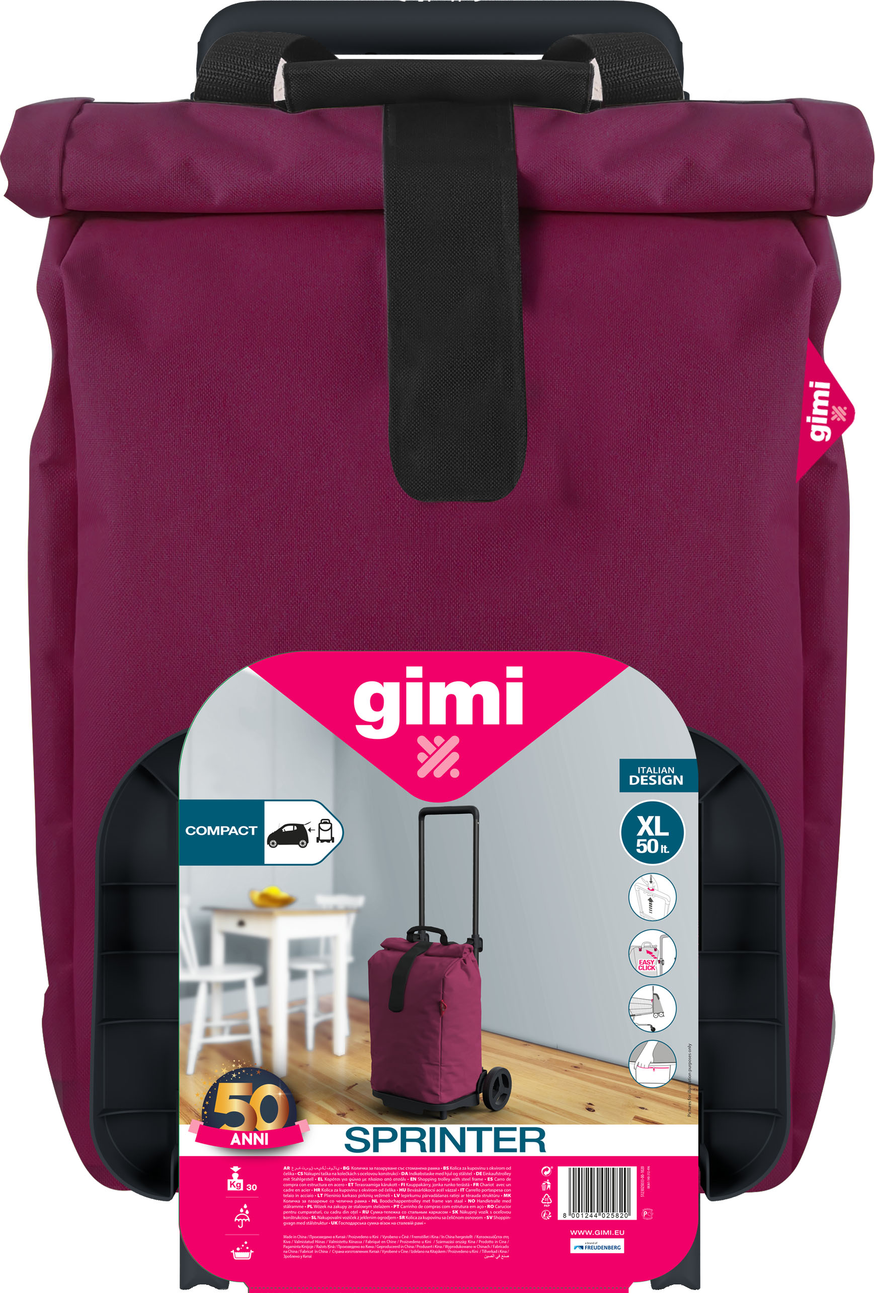Per chi desidera un carrello portaspesa che abbia un ingombro ridotto quando non in uso, ma che al contempo garantisca una capienza importante, Gimi Sprinter è dotato di manico telescopico e maniglia in resina ABS ed è estremamente compatto da chiuso. La sacca in poliestere da 50 l è antipioggia, lavabile e facilmente rimovibile, grazie al sistema “Easy-click”; inoltre, la tasca interna con zip è ideale per riporre piccoli oggetti. La struttura in acciaio lo rende leggero e facile da manovrare, trasportando fino a 30 kg. Gimi Sprinter è disponibile in due varianti colore: Black Meteorite e Raspberry.