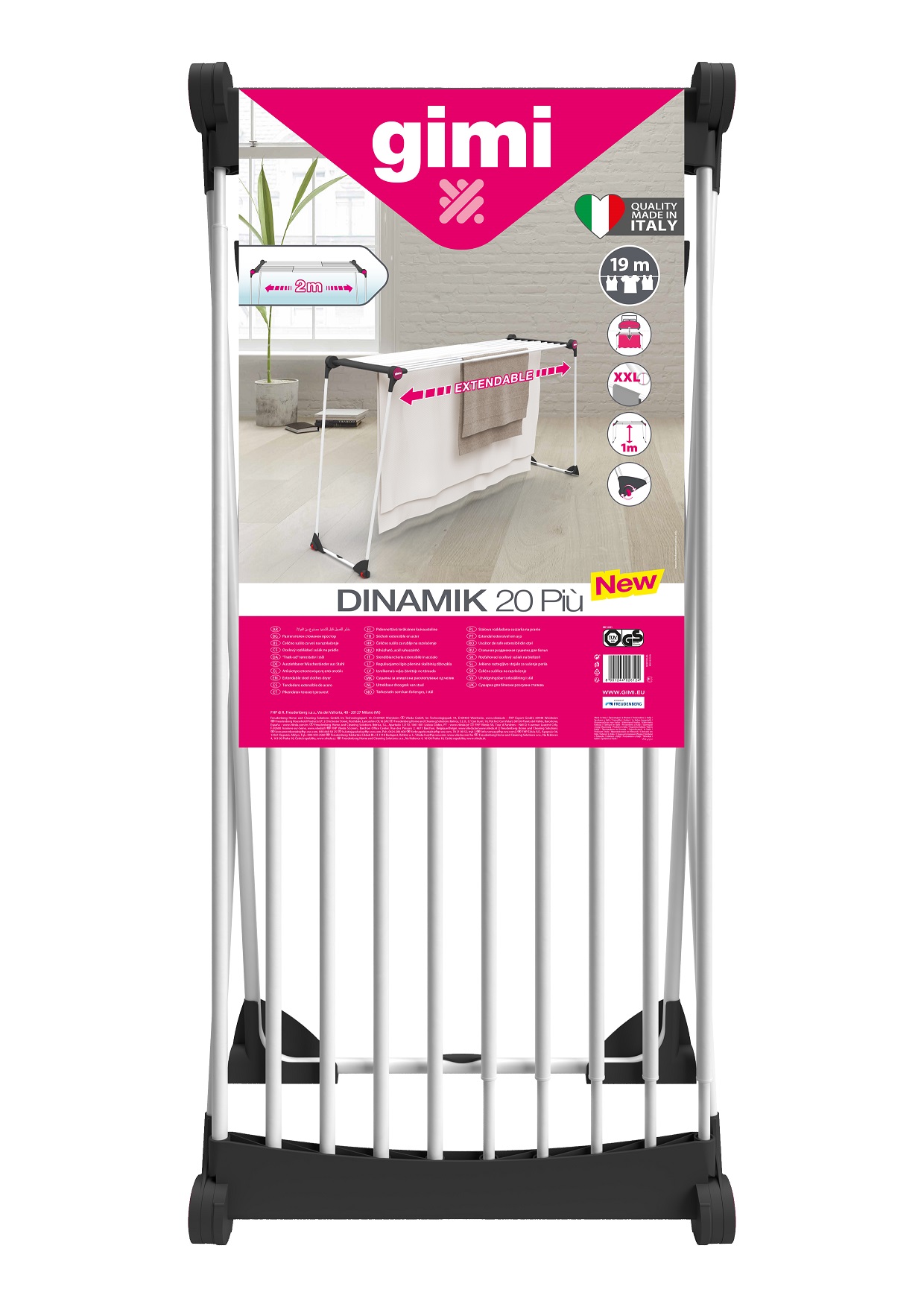 Gimi Dinamik 20 Più è lo stendibiancheria che si allunga, ideale per stendere anche capi di grandi dimensioni; realizzato in acciaio, con griglia centrale telescopica, estensibile da 117 fino a 205 cm, consente di ottimizzare lo spazio di stenditura secondo le proprie necessità e di stendere agevolmente anche capi ingombranti come tovaglie o lenzuola senza piegarli, riducendo in questo modo il tempo di asciugatura.