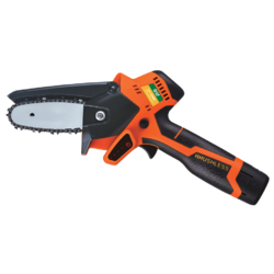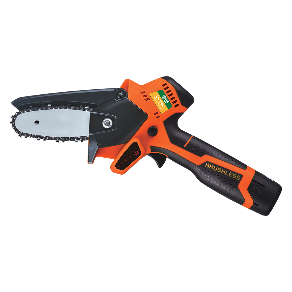 Il potatore a batteria LF-10MP è adatto per l'uso con una sola mano. Compatto e maneggevole, è indicato in operazioni di potatura. Impugnatura ergonomica soft grip, consente tagli fino a Ø 25 mm. Lunghezza barra 10 cm. A doppia posizione di taglio, ampia copertura dell'impugnatura e catena a basso contraccolpo garantiscono un funzionamento sicuro. Motore brushless, passo catena 1/4', velocità di taglio 6,7 m/s. Lubrificazione della catena manuale (non automatica). Completo di batteria, carica batteria, copri barra, chiave di servizio. Peso senza accessori 970 gr.