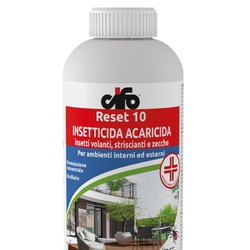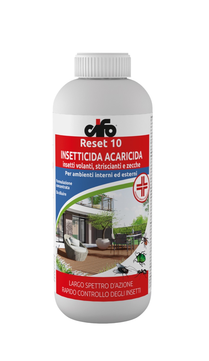 Dal catalogo Cifo, Reset 10 è un insetticida-acaricida concentrato ad ampio spettro che agisce per contatto e ingestione nel controllo di insetti volanti, striscianti e zecche.