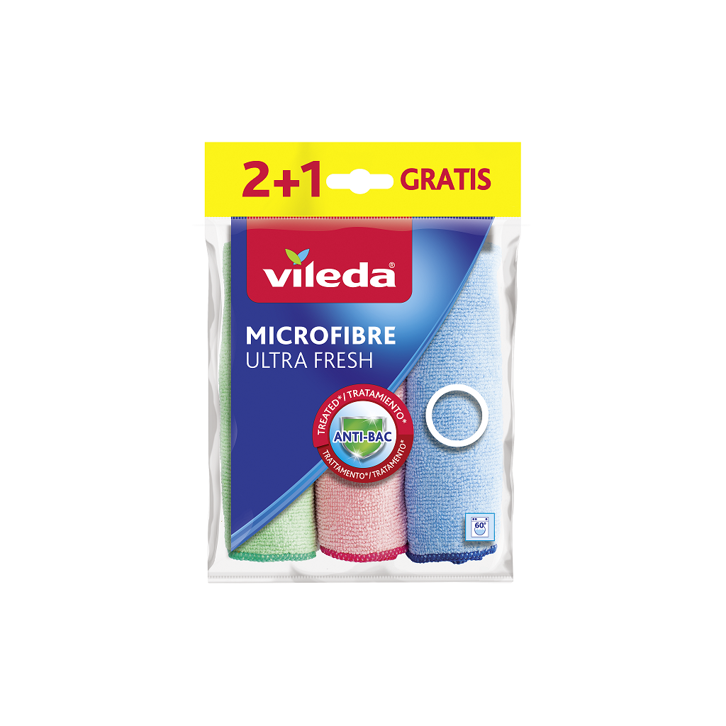 Vileda Microfibre Ultra Fresh è disponibile nel formato convenienza 2+1: 1 panno su 3 è in omaggio.