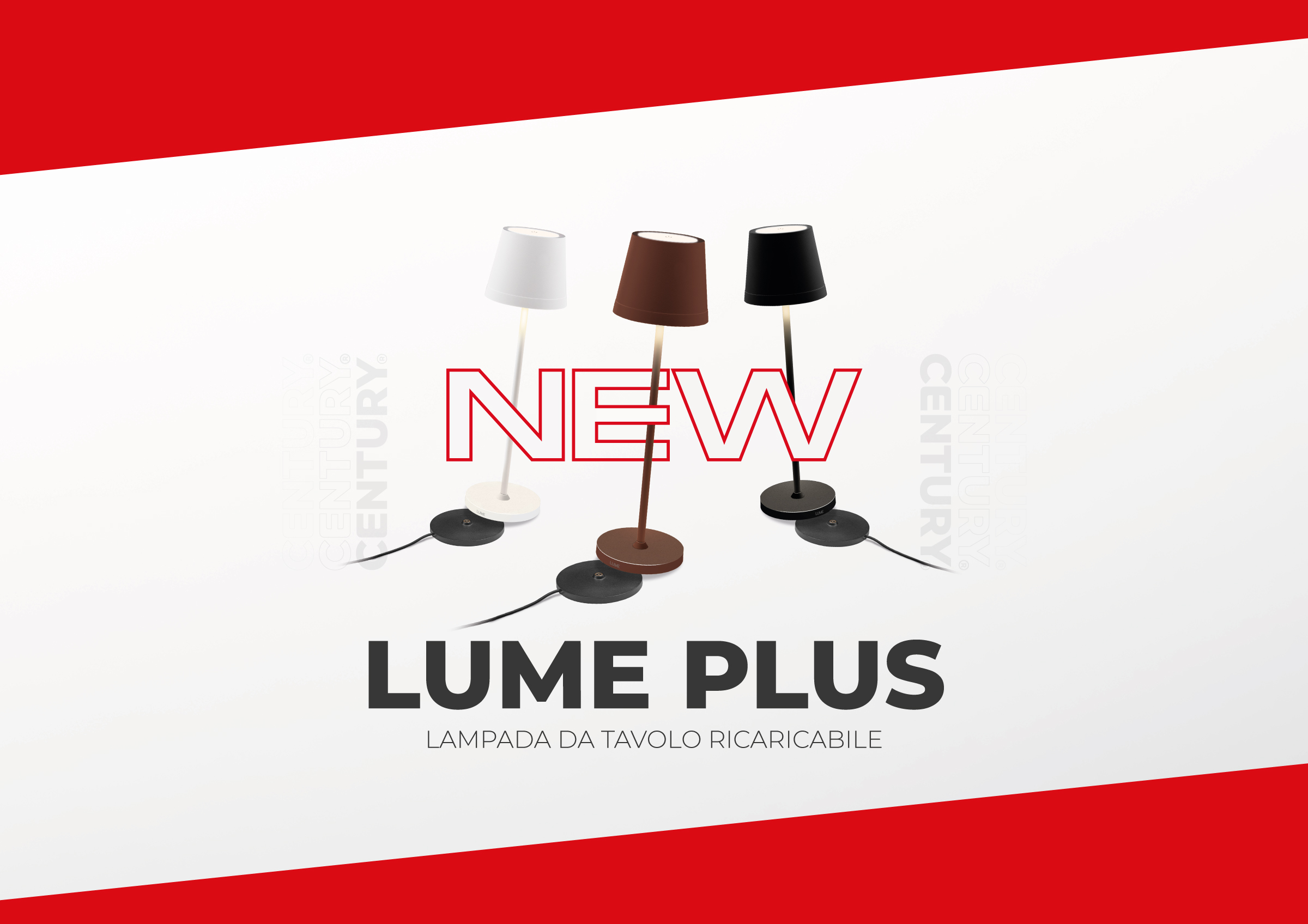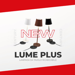 CENTURY presenta una grande novità per LUME PLUS: la più famosa lampada da tavolo ora raddoppia le sue modalità di ricarica, scegli tra il cavo USB-C oppure con base di ricarica a contatto.