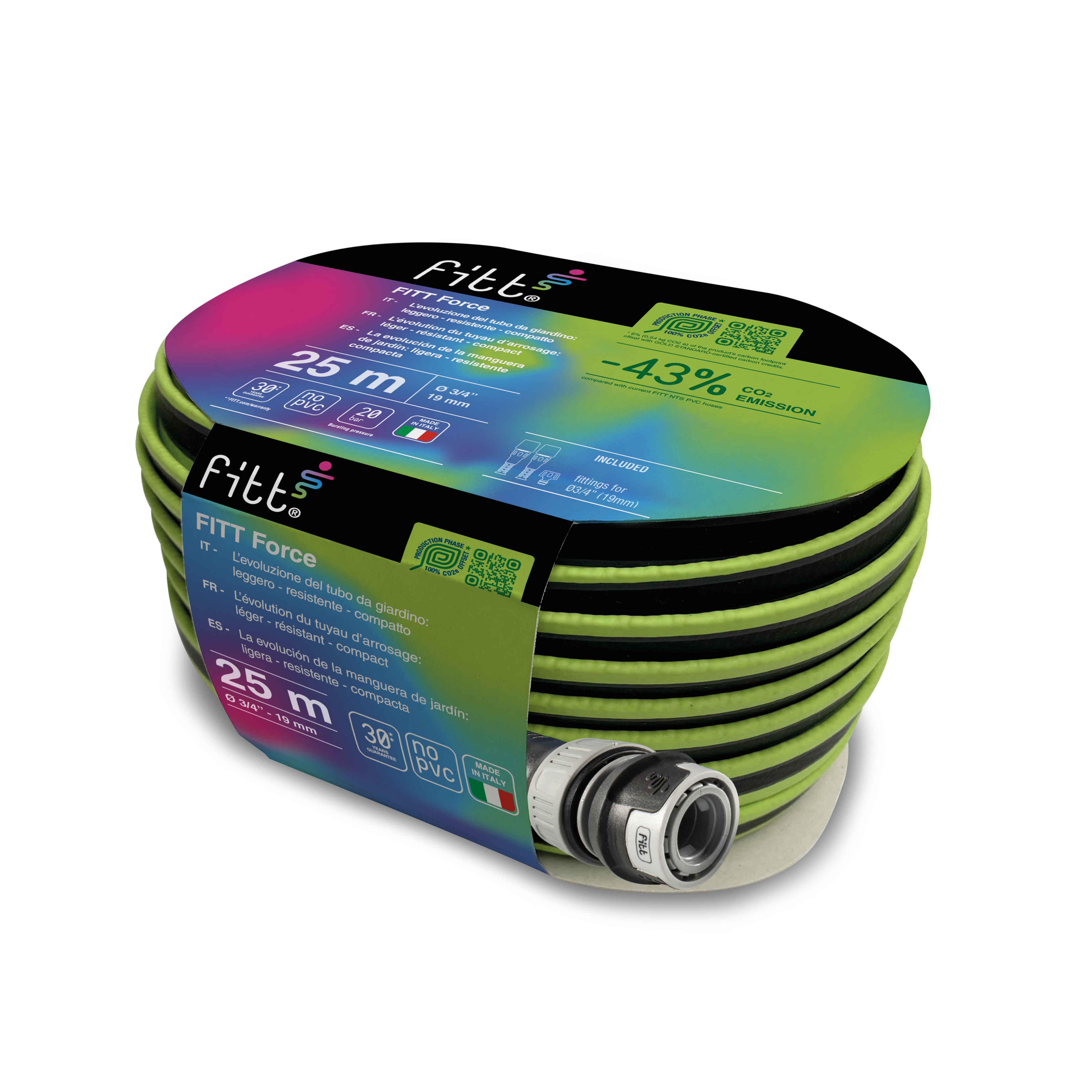 FITT Force è il tubo da giardino leggero e compatto, per uso intensivo, sviluppato secondo le linee guida di ecodesign, prima fra tutte la riduzione.