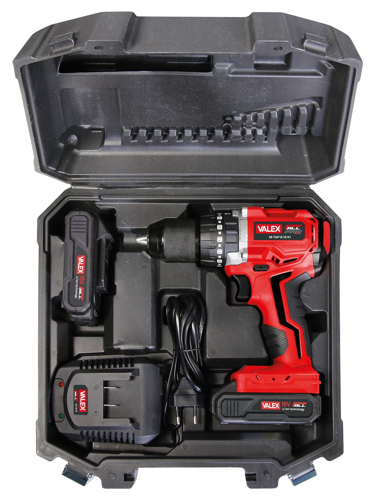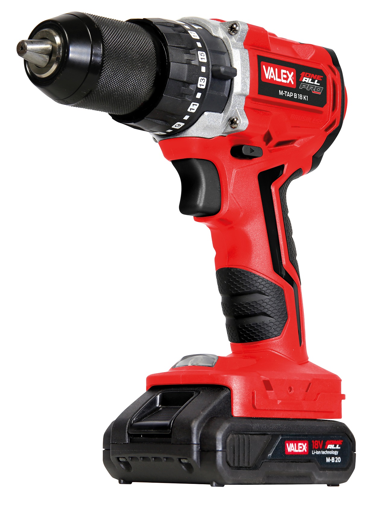 Valex M-TAP B 18 K1 è un trapano avvitatore brushless a 2 velocità con percussione, dalla struttura compatta e dal peso contenuto, alimentato da una batteria al litio da 18 V. Lavora con una velocità a vuoto di 0-500 o 0-2.000 giri/min. M-TAP B 18 K1 è equipaggiato con un mandrino autoserrante in acciaio di 13 mm, trasmissione con ingranaggi in acciaio e 21+1+1 posizioni della frizione. Coppia torsione Max 62 Nm. Il motore senza spazzole assicura efficienza, durata e manutenzione ridotta. L’impugnatura morbida garantisce un’ottima presa ed è provvisto inoltre di una pratica luce led crepuscolare. Venduto con 2 batterie da 2,0Ah, caricabatterie e valigetta.