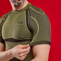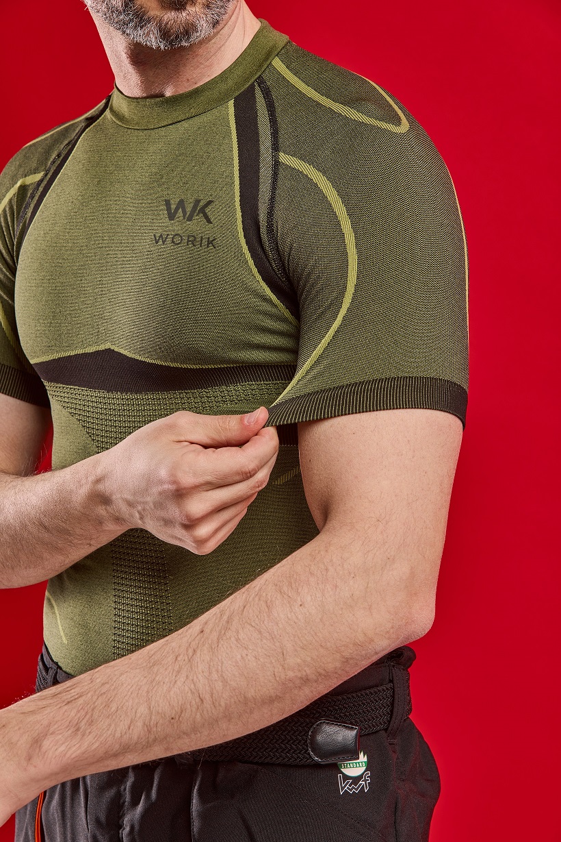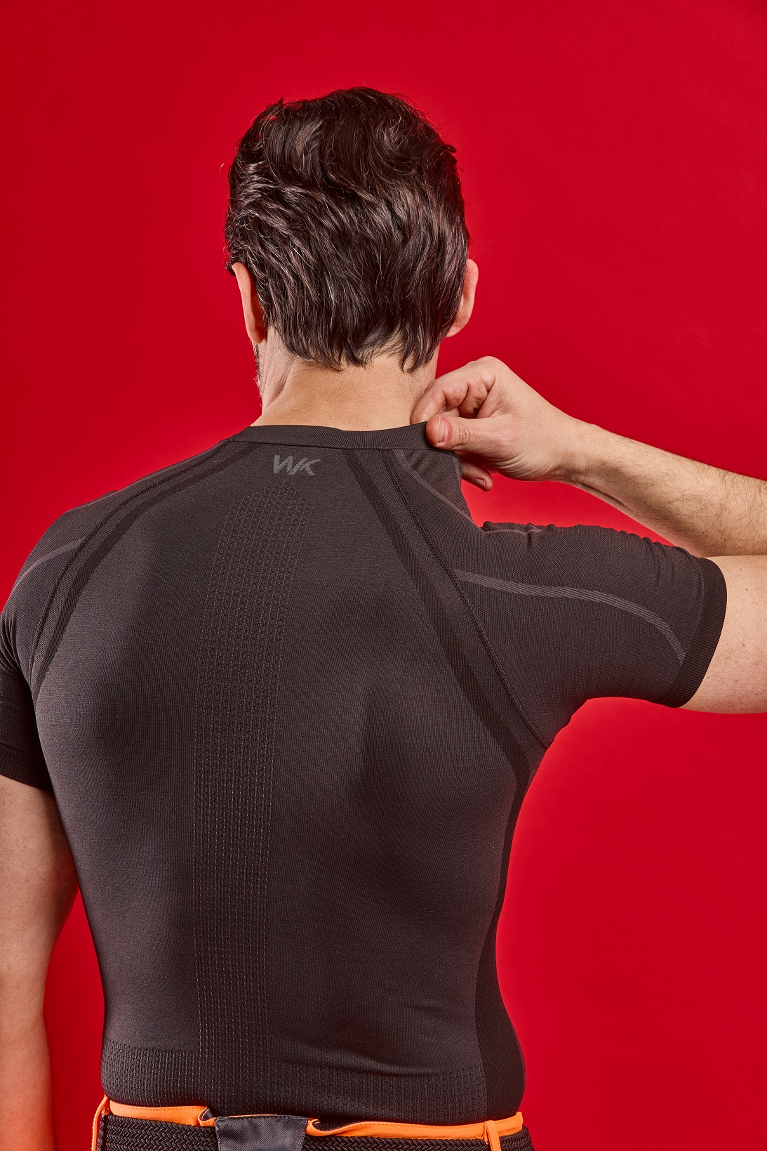 La maglia Wien, a manica corta e girocollo, è realizzata con filati Dryarn® e Lycra attraverso una tecnologia di tessitura seamless che permette di assicurare vestibilità, funzionalità e durata nel tempo. La compressione graduata che la caratterizza stimola il flusso sanguigno capillare sostenendo più a lungo la tonicità muscolare e riducendo il senso di stanchezza. Sui principali gruppi muscolari i profili anatomici, senza cuciture, sono elasticizzati per donare una maggiore libertà di movimento, estensione ed espansione.