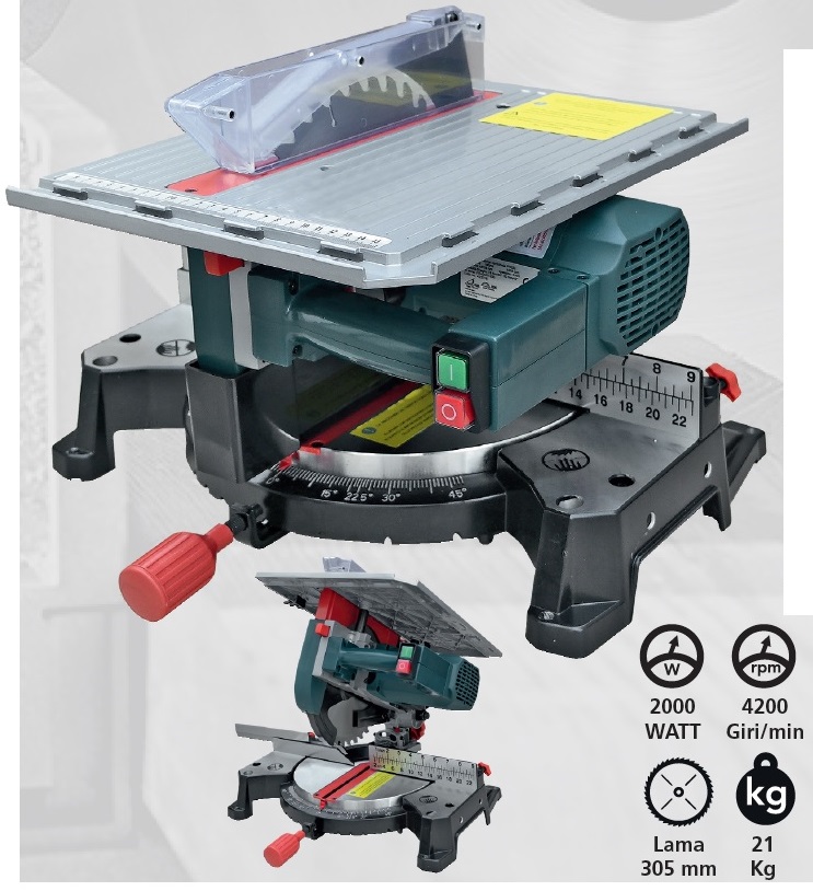 Mistral presenta la troncatrice combinata PH305. Le principali caratteristiche tecniche sono: potenza max 2000 W; tensione 230 V ~ 50 Hz; giri/min. 4200; lama mm 305; n. denti 48; inclinazione 0- 45°; piano girevole, scala graduata, estensioni laterali; dimensioni piano lavoro cm 46,5 x 38; peso 21 kg.