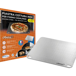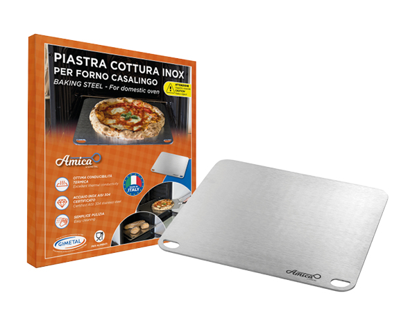 La piastra è uno degli articoli della linea Amica by Gi.Metal, una linea pensata per chi prepara la pizza in casa e ricerca strumenti di qualità, leggeri, maneggevoli che ne facilitino la riuscita. Permette di cuocere la pizza nel forno di casa o nel barbecue in pochi minuti, con risultati paragonabili al forno professionale. Misura 40x35 cm ed è realizzata in acciaio inox AISI 304, spesso 4 mm, con coefficiente di conducibilità termica 10 volte superiore rispetto a una comune pietra refrattaria. Assorbe, immagazzina e trasferisce il calore garantendo una cottura ottimale e uniforme. Come tutti i prodotti della Linea Amica by Gi.Metal è certificata per uso alimentare.