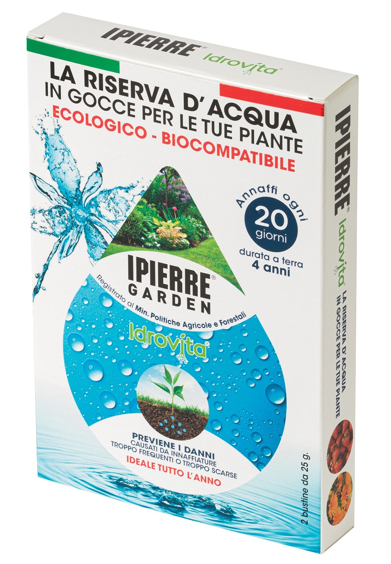Idrovita è un polimero super assorbente in granuli appositamente studiato per ridurre il consumo di acqua, regolare l’alimentazione idrica e ossigenare il terreno. I granuli sono in grado di assorbire acqua fino a 100 volte il loro peso, garantendo la giusta umidità del terreno fino a 20 giorni. Le radici raggiungono le gocce e assimilano l’acqua di cui hanno bisogno, prevenendo i danni causati da annaffiature troppo frequenti o troppo scarse. Idrovita è adatto sia alle piante d’appartamento sia a quelle da esterno.