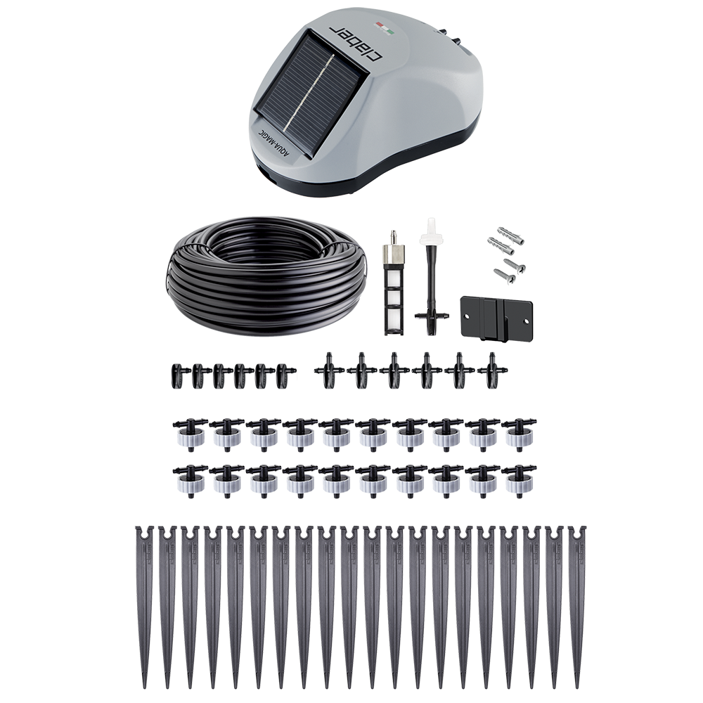 Si tratta di un kit contenente tutto il necessario per l’irrigazione di massimo 20 piante attivato da un programmatore con pompa integrata in grado di pescare acqua da un qualsiasi serbatoio e indirizzarla ai gocciolatori.