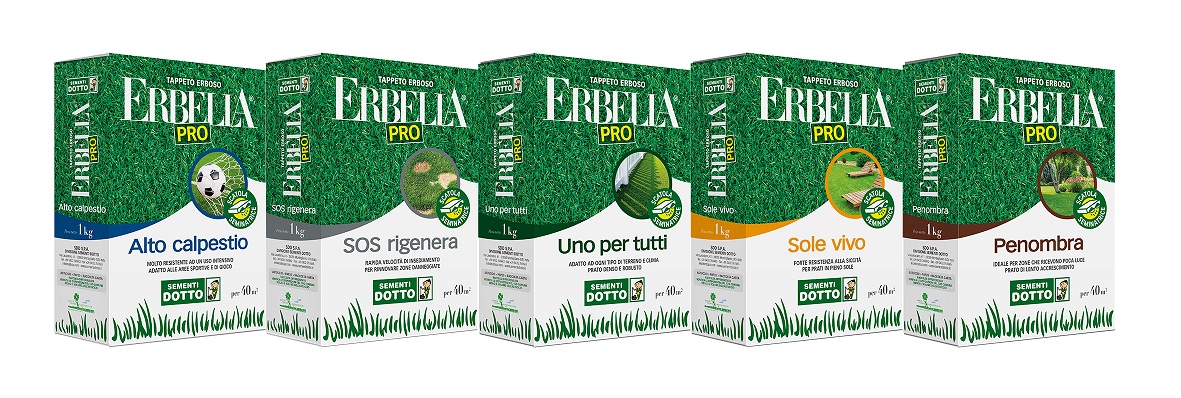 Per soddisfare le esigenze specifiche dei proprietari di giardini, Erbella PRO mette a disposizione cinque miscugli speciali: uno per tutti, prato denso e robusto adatto a ogni tipo di terreno e clima; sole vivo, per prati in pieno sole e con una forte resistenza alla siccità; penombra, prato di lento accrescimento ideale per zone che ricevono poca luce; alto calpestio, molto resistente a un uso intensivo e quindi adatto alle aree sportive e di gioco; SOS rigenera, per rinnovare zone danneggiate con una rapida velocità di insediamento.