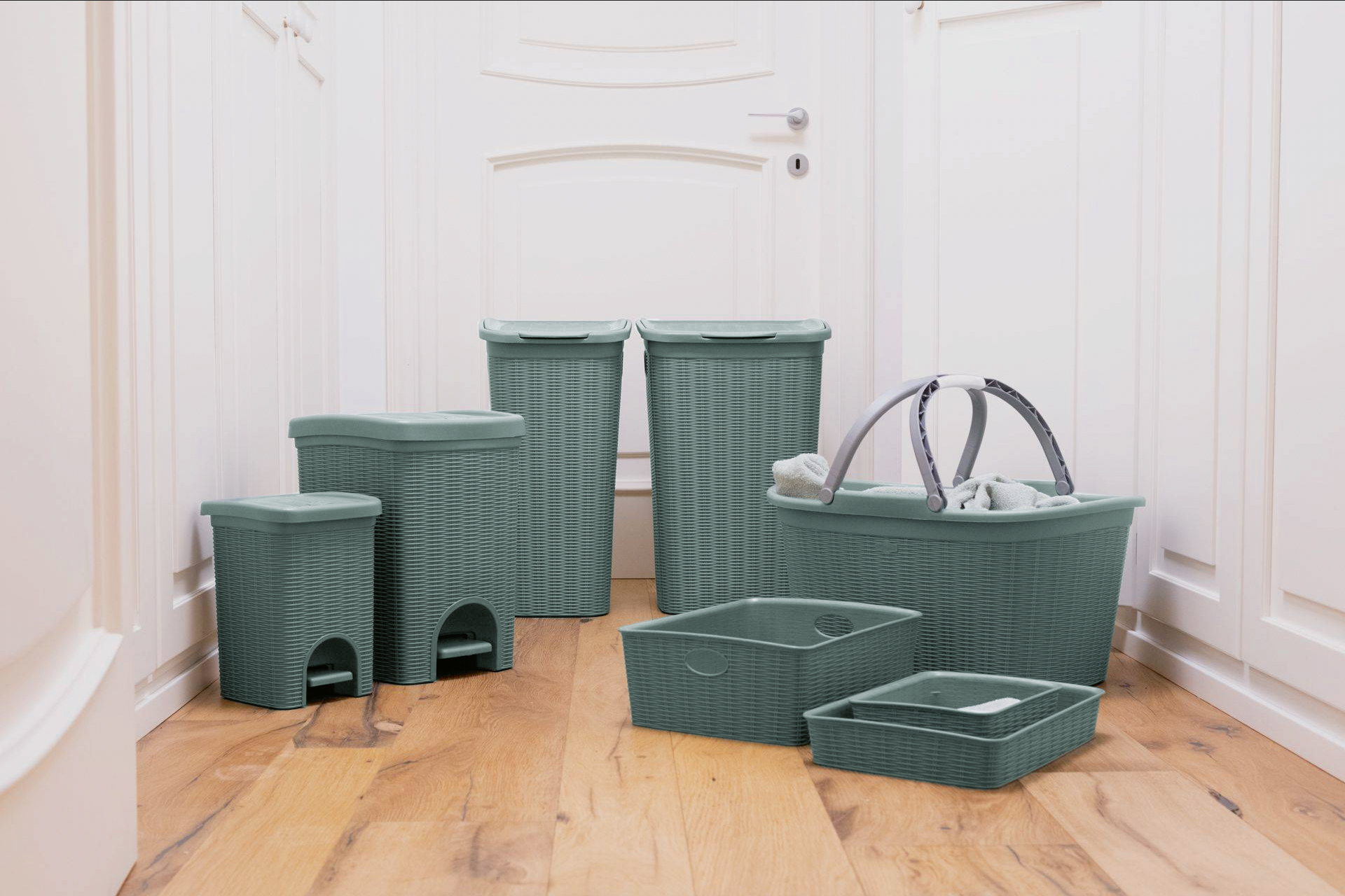 La vasta gamma di prodotti include: cestini portaoggetti, cassettiere a 3 e 4 cassetti, cesti portabiancheria con e senza manici, pattumiera da 6 e da 20 L con pedale, scopino da bagno, portabiancheria da 36 e 50 L e portaombrelli.