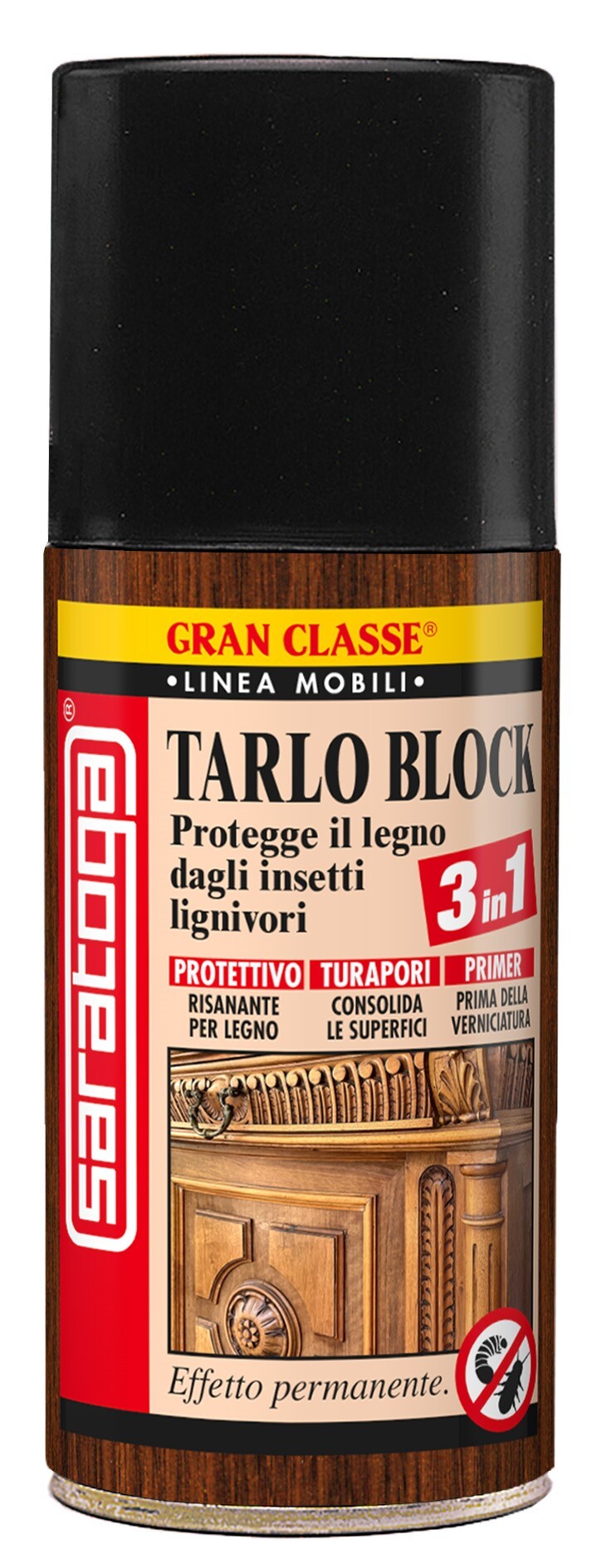 Tarlo Block è lo spray protettivo ideale per risanare il legno. Particolarmente indicato per contrastare e neutralizzare l’attacco degli insetti lignivori in modo permanente: ne evita l’insediamento e la colonizzazione perché penetra in profondità e occlude i piccoli fori del legno. Incolore, è ideale per risanare i legni trattati e restaurare e preservare mobili, porte, finestre, travi, perlinature, zoccolini e vari altri tipi di manufatti e opere lignee in genere.