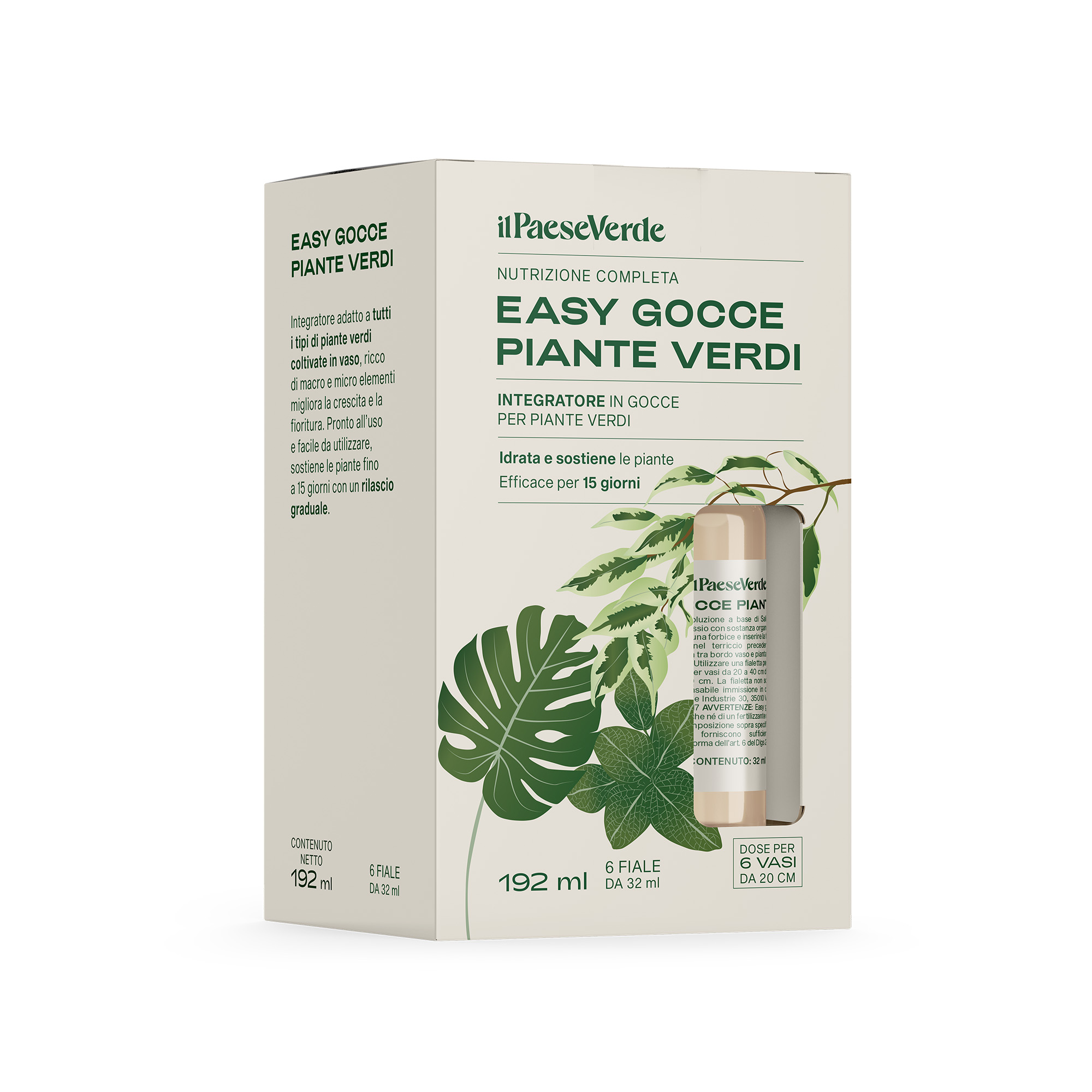 Per le piante verdi da indoor, Il Paese Verde propone Easy Gocce Piante Verdi, l’integratore adatto a tutti i tipi di piante verdi coltivate in vaso e in terrarium. Proposte in comode fiale pronte all’uso, sono ricche di macro e micro elementi. È a base di sali minerali a base di azoto, fosforo e potassio con sostanza organica e microelementi che grazie a un rilascio graduale sostiene le piante fino a 15 giorni. Può essere impiegato in tutti i mesi dell’anno.