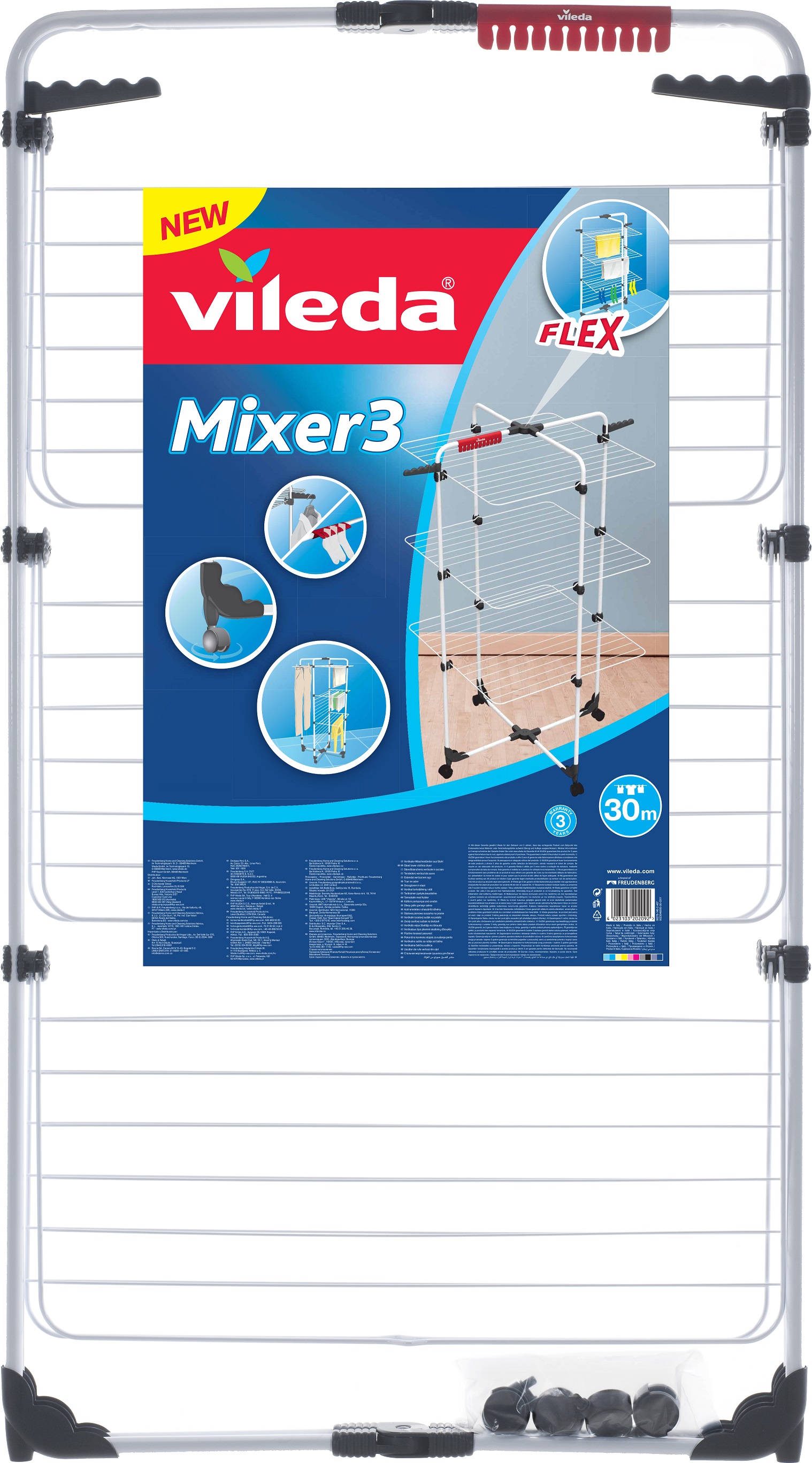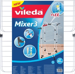 Vileda Mixer 3 è lo stendibiancheria a torre, ideale per chi desidera una soluzione modulabile e salvaspazio; è dotato di uno snodo speciale che permette di utilizzare le griglie totalmente aperte oppure a metà, in funzione del bucato. Lo sviluppo in verticale con 3 ripiani ripiegabili garantisce 30 metri di stenditura (pari a circa 3 carichi di lavatrice) e permette a Mixer 3 di essere posizionato anche nel box doccia. Una volta chiuso, occupa pochissimo spazio e da aperto, grazie alle pratiche 4 ruote piroettanti, può essere facilmente spostato anche carico. È provvisto inoltre di un supporto per piccoli capi e 2 appendi-grucce, perfetti per i capi che asciugano meglio appesi.