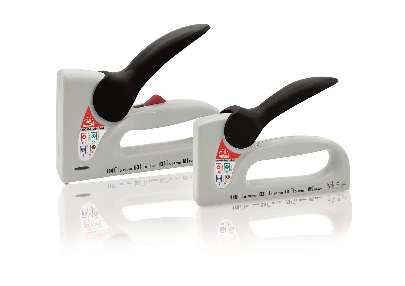 Le fissatrici manuali Romatak 4.0 maestri® sono progettate per utilizzare quattro diversi tipi di punti e chiodini metallici in un’unica fissatrice senza necessità di regolazione.