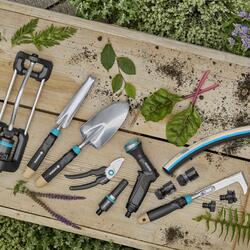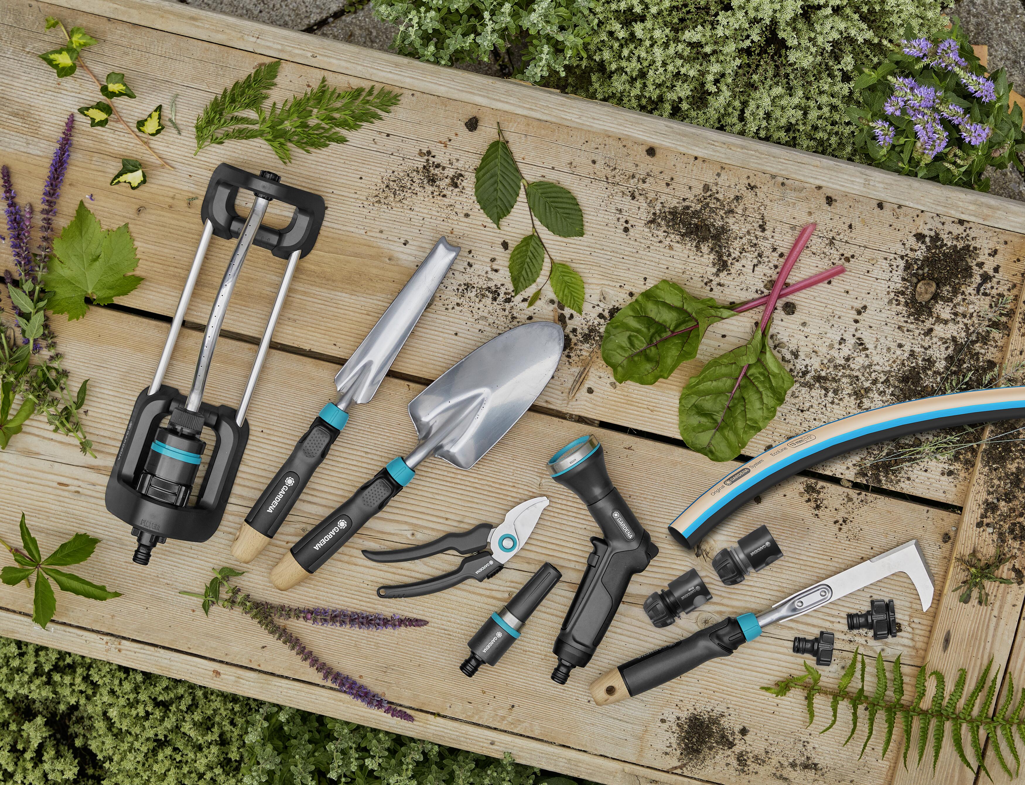 La linea si compone di un Set base per l’irrigazione, una lancia a doccia a impulsi; un irrigatore oscillante; tre attrezzi manuali (trapiantatore, estirpatore e raschietto) e un paio di forbici da giardino.