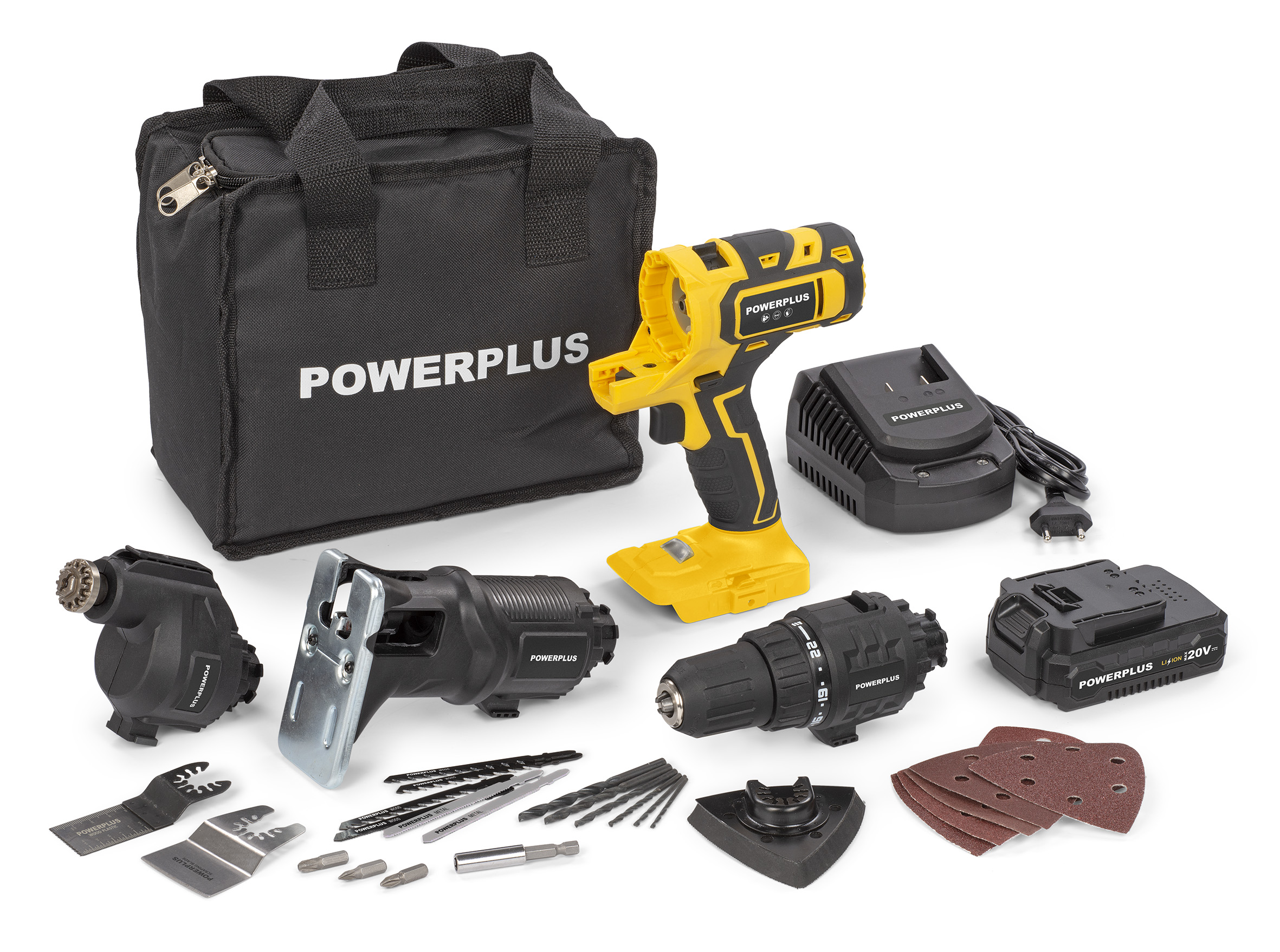 In dotazione sono compresi: valigetta in nylon per il trasporto; batteria da 20 V – 2 Ah; caricabatteria: 25 accessori assortiti (punte, inserti, lame per seghetto, lame e carte abrasive per utensile multiuso). Luce led frontale.