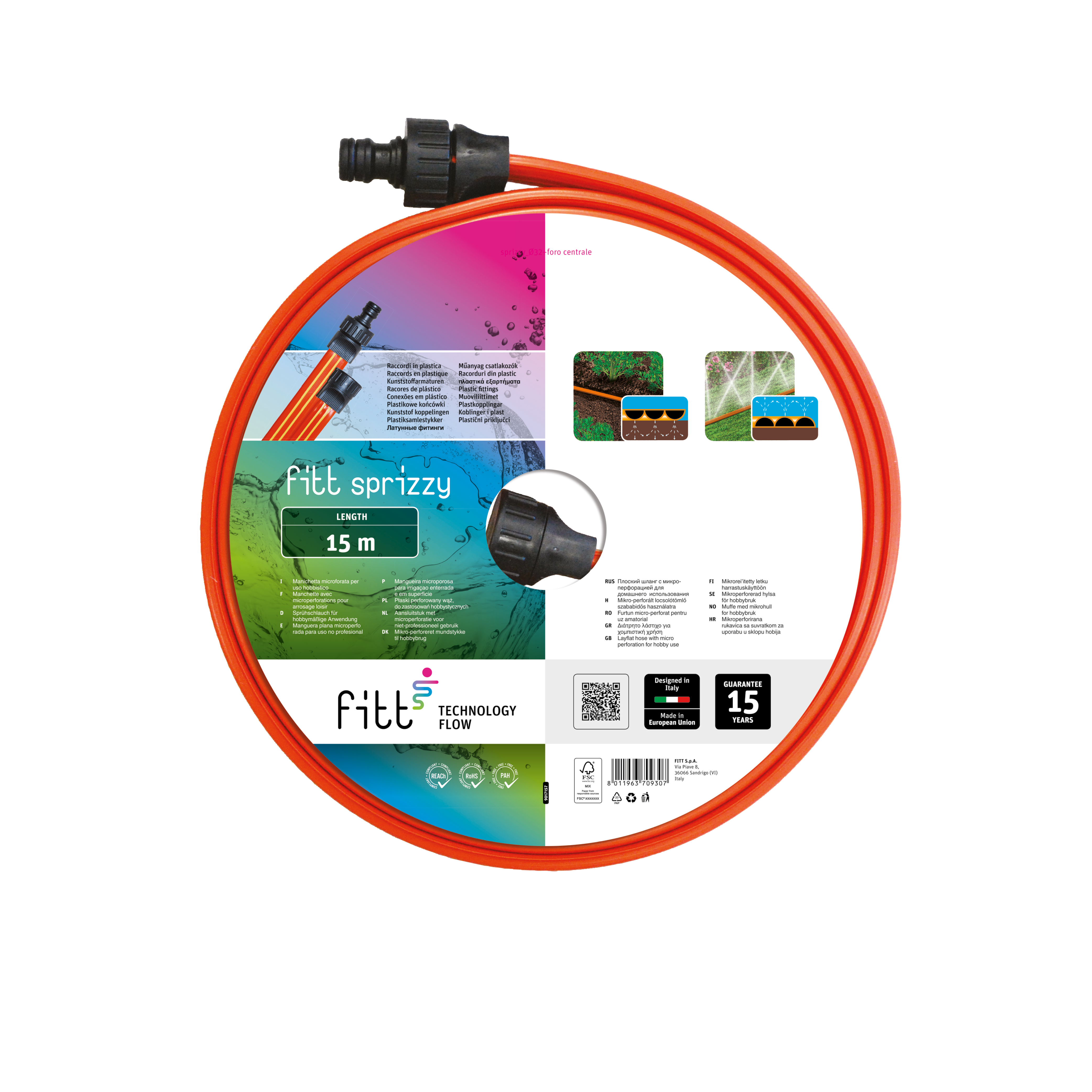 FITT Sprizzyè un tubo manichetta microforata a 3 vie, per uso hobbistico, ideale per irrigare a getto superfici strette e lunghe, come aiuole e bordature.