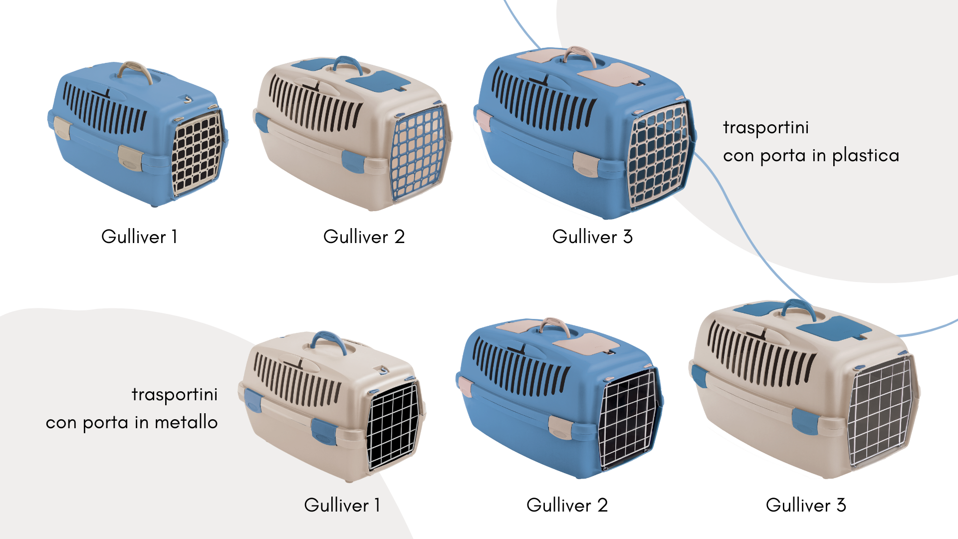 Disponibile nelle misure Gulliver 1, 2 e 3 con dimensioni rispettivamente di 48x32x31h cm, 55x36x35h cm, 61x40x38h cm, il trasportino può essere scelto con porta in plastica o in metallo.