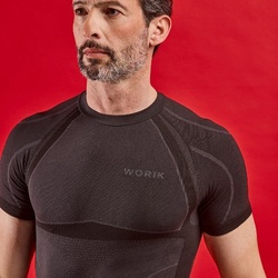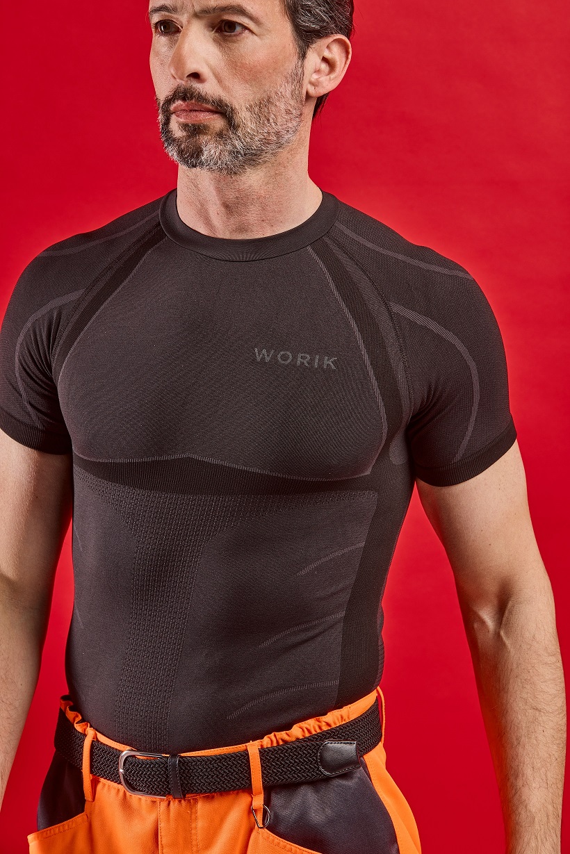 Da Worik, la maglia Wien, a manica corta e girocollo, è realizzata con filati Dryarn® e Lycra attraverso una tecnologia di tessitura seamless che permette di assicurare vestibilità, funzionalità e durata nel tempo. La compressione graduata che la caratterizza stimola il flusso sanguigno capillare sostenendo più a lungo la tonicità muscolare e riducendo il senso di stanchezza. Sui principali gruppi muscolari i profili anatomici, senza cuciture, sono elasticizzati per donare una maggiore libertà di movimento, estensione ed espansione. Le fibre utilizzate garantiscono il massimo comfort. La microfibra più leggera esistente in natura Dryarn® mantiene asciutto e climatizzato il corpo in ogni stagione e in ogni condizione operativa, oltre a contrastare la proliferazione di batteri, che possono generare muffe, micosi e sgradevoli odori, grazie alle proprietà batteriostatiche. Il Lycra conferisce morbidezza, stabilità anche dopo molti lavaggi, nonché una rapida asciugatura e nessuna necessità di stiratura.
