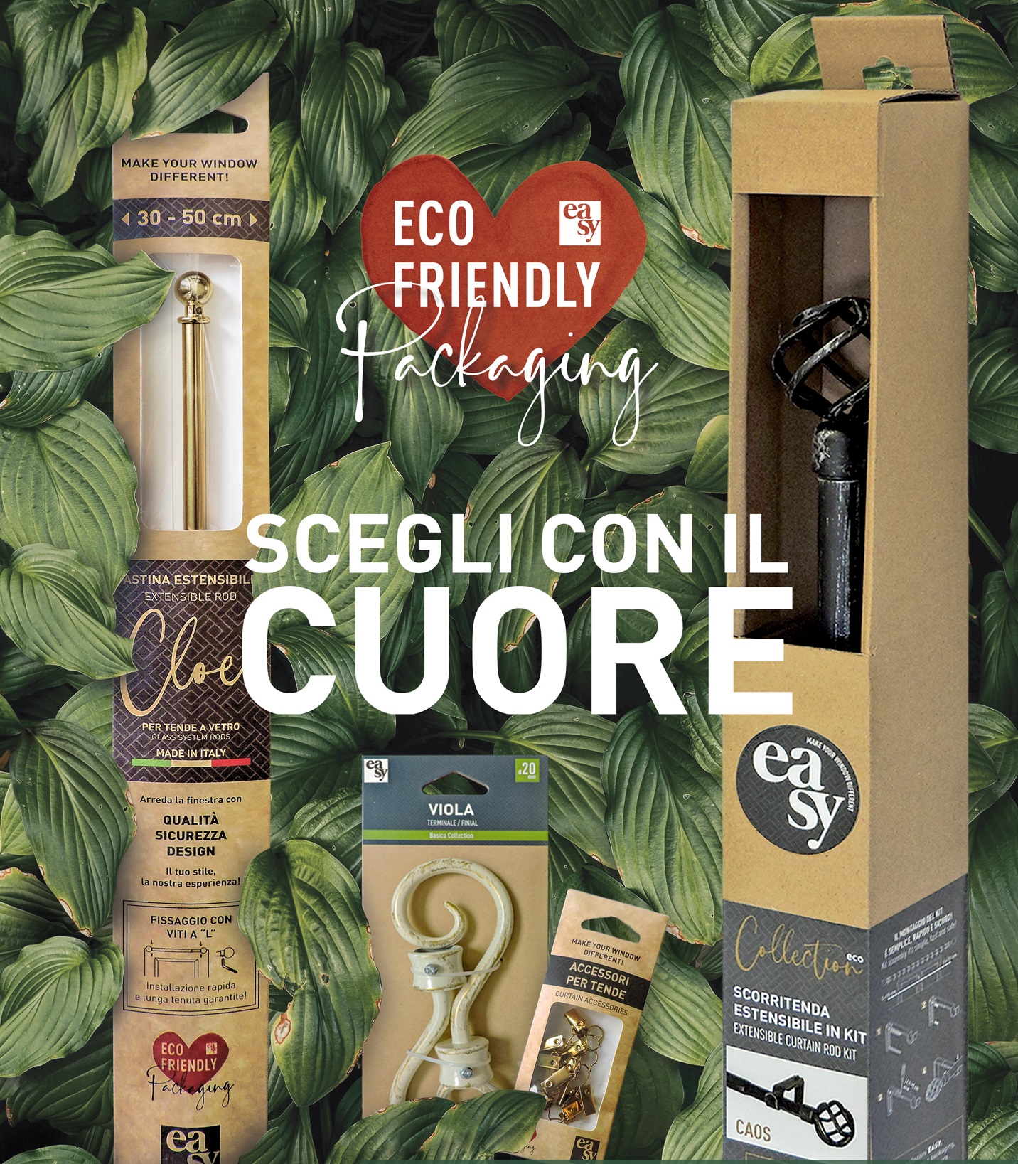 Easy, marchio italiano di Emmebi specializzato in prodotti tecnici e decorativi legati al mondo della finestra, è orgogliosa di presentare al mercato del Fai da te le collezioni decorative e le astine Made in Italy nelle nuove confezioni ecosostenibili. Prodotti prestazionali di alta qualità, frutto di un sapiente equilibrio tra la tradizione dell’artigianalità italiana e la continua ricerca di innovazione e cura del dettaglio, presentati in una nuova, moderna e sostenibile veste. Sappiamo infatti che le risorse del pianeta non sono infinite e siamo lieti di presentare quello che definiamo “Il Buon Packaging”. Le nuove confezioni, caratterizzate dal “cuore Easy”, hanno un’anima green: realizzate in fibra vergine certificata FSC, rispettano il prodotto, il consumatore e l’ambiente. Scegli col cuore, è Easy!