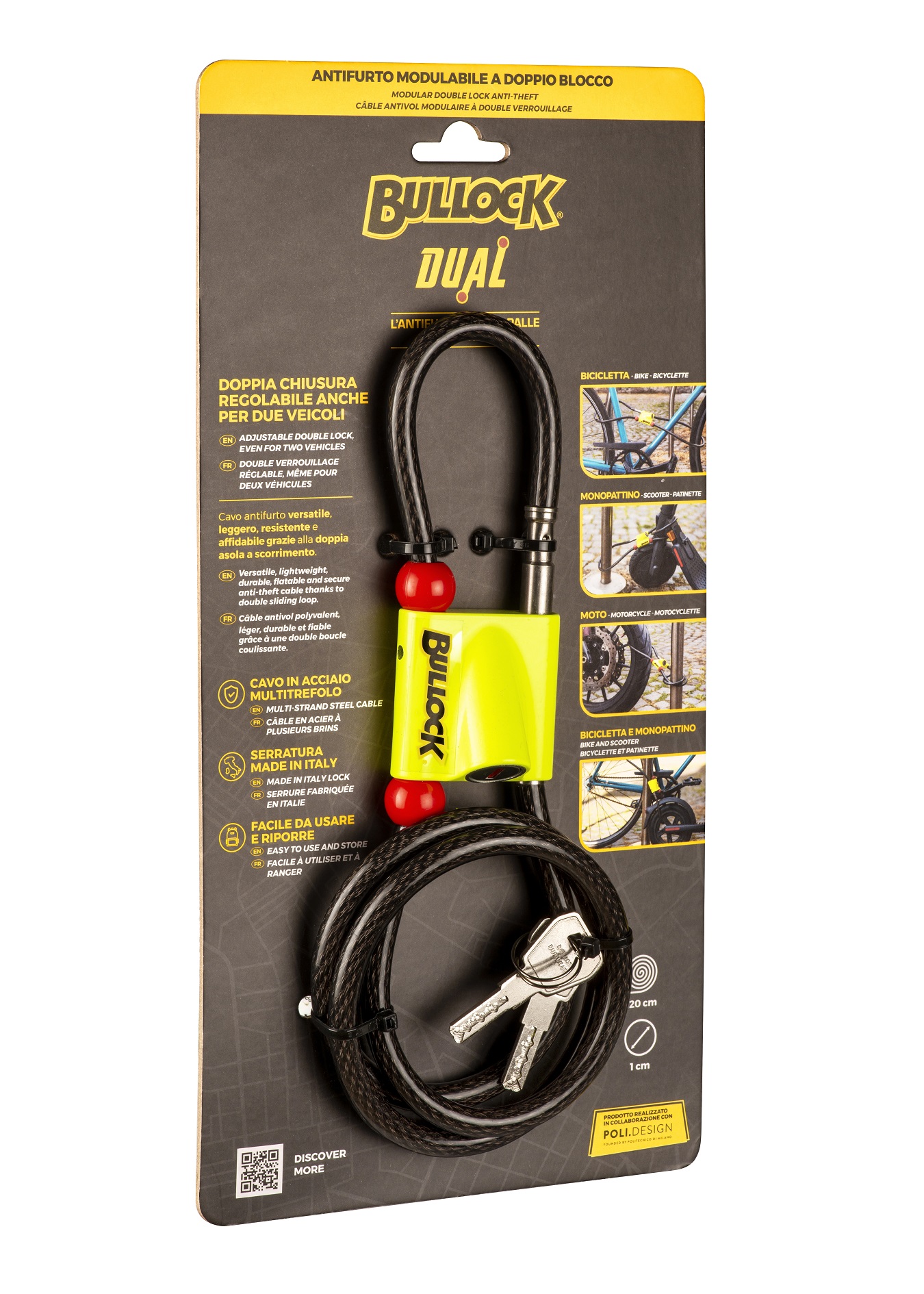 Bullock® Dual è il cavo antifurto versatile, leggero, resistente e sicuro grazie alla doppia asola a scorrimento. La sua innovativa doppia chiusura regolabile, lo rende adattabile a qualunque esigenza per la “salvaguardia” di una bicicletta, monopattino o moto.
