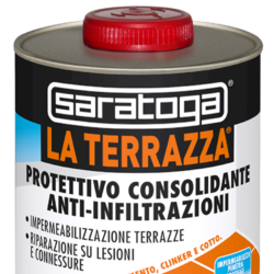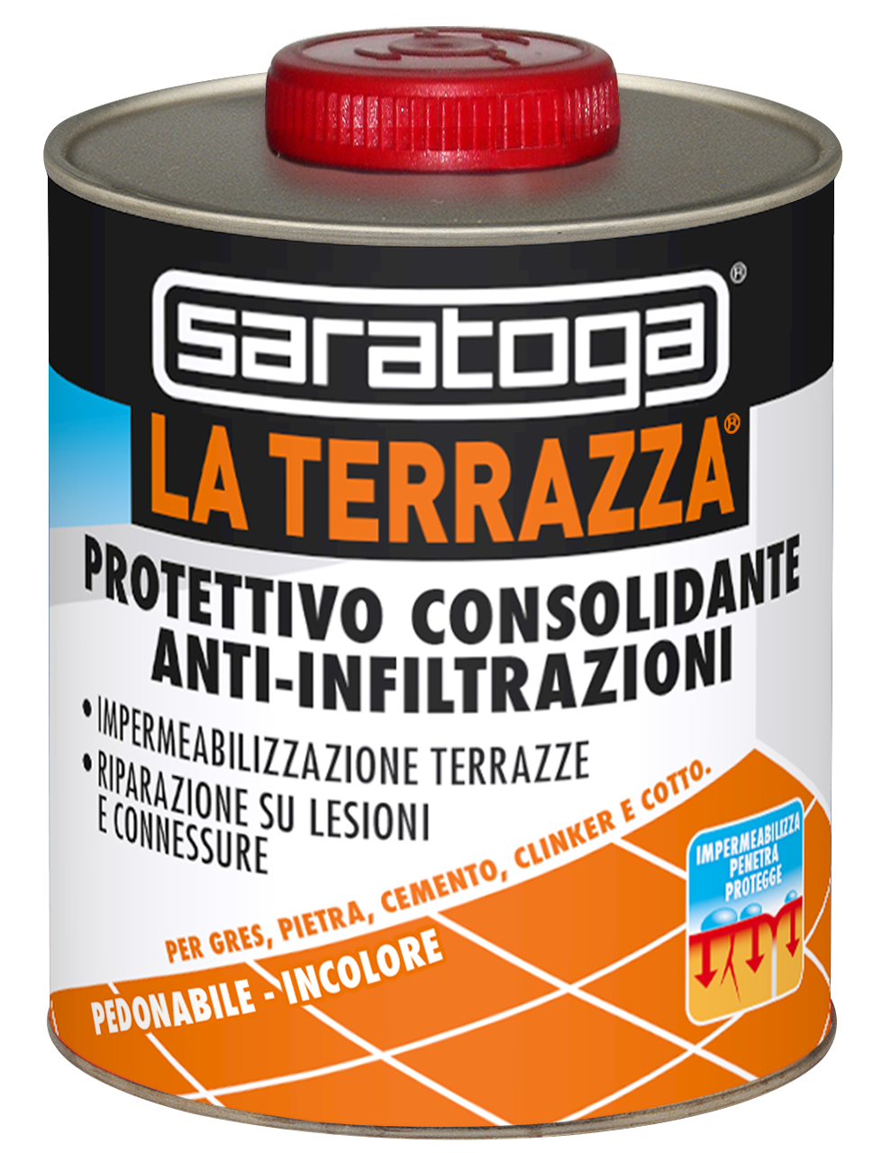 La Terrazza è il nuovo protettivo consolidante anti-infiltrazioni che i laboratori di Saratoga hanno specificamente realizzato per proteggere efficacemente da acqua e umidità i pavimenti di balconi e terrazze in monocottura, pietra naturale, cemento, clinker, gres o cotto.