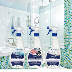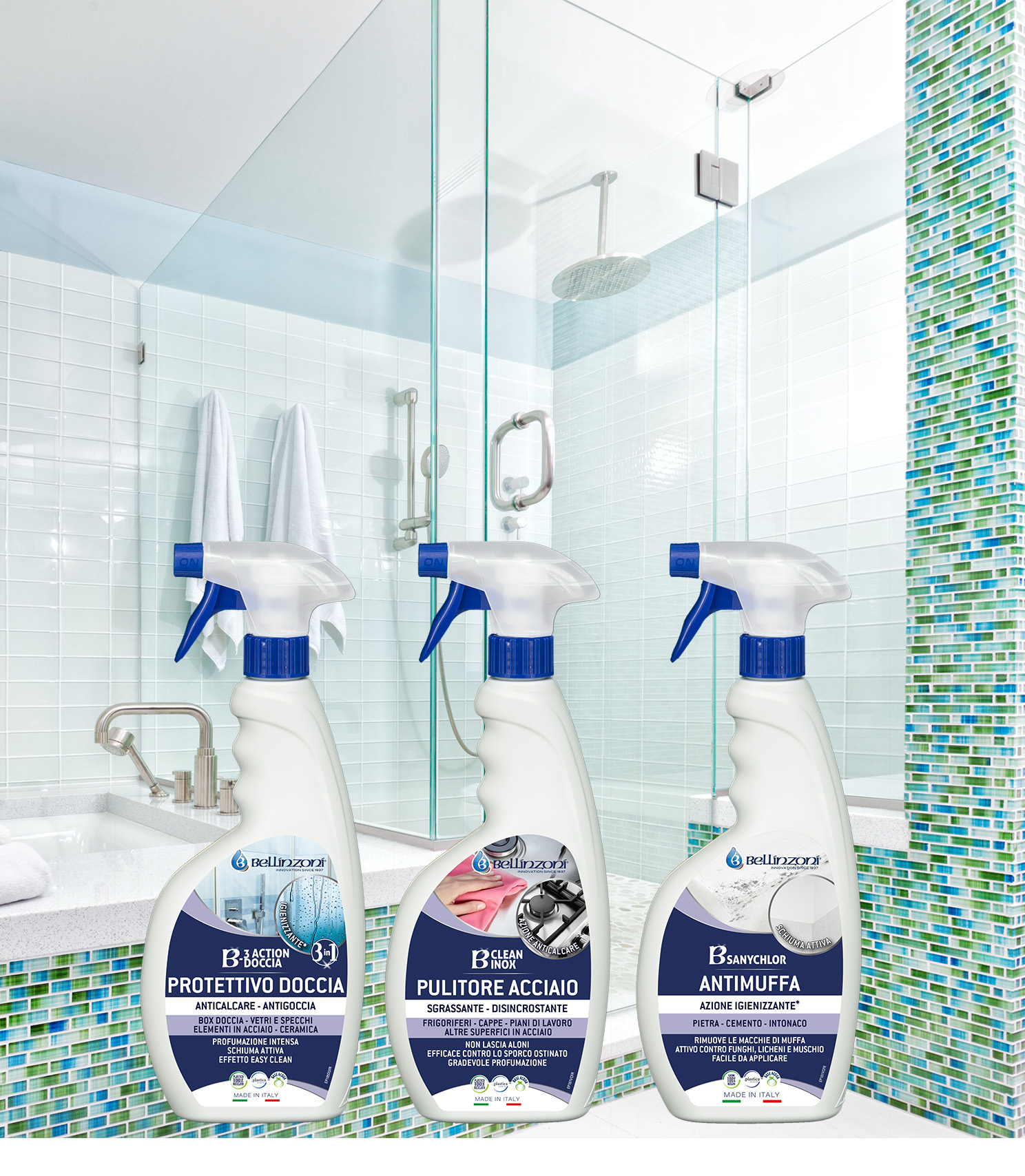 Bellinzoni dal 1937 produce specialità chimiche per il fai da te specifiche per pulizia, protezione, lucidatura e manutenzione di pavimenti e rivestimenti in pietra, grès, ceramica, cotto, parquet, PVC, SPC. B-3Action Doccia igienizza, pulisce, protegge docce, rubinetteria, ceramica; profumato con effetto anti-goccia. B-Sanychlor, con schiuma attiva, elimina macchie di muffa e funghi su muri e rivestimenti. B-Clean Inox pulisce e sgrassa le superfici in acciaio e metallo; elimina sporco e calcare.