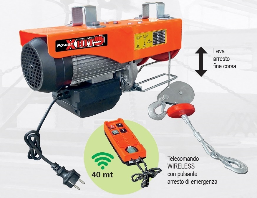 Grazie al telecomando wireless dotato di pulsante arresto di emergenza, con una portata massima di 40 metri, il paranco può essere installato liberamente a varie altezze, tenendo comunque conto della connessione alla rete elettrica.