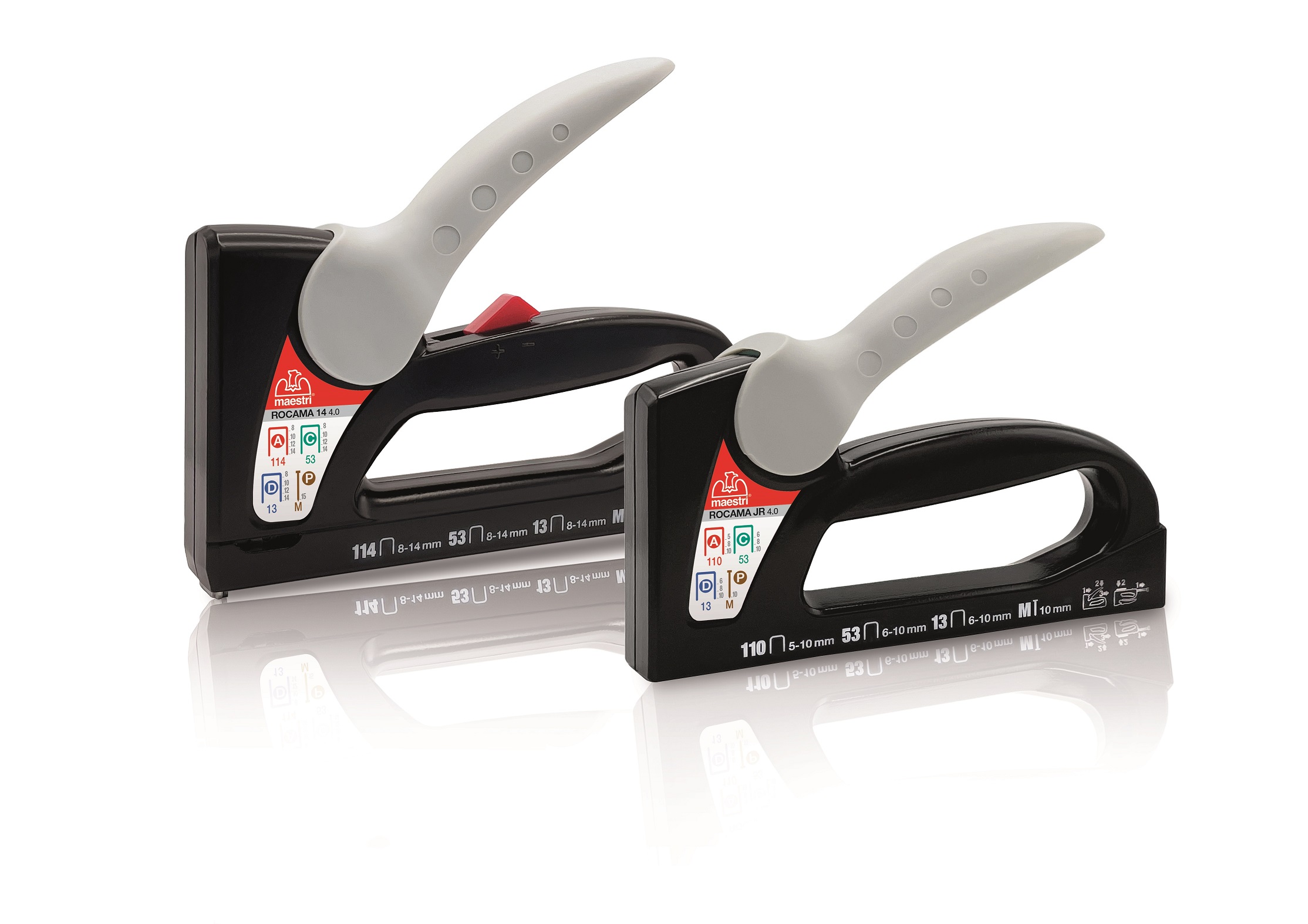 Le fissatrici manuali Rocama 4.0 maestri®sono progettate per utilizzare quattro diversi tipi di punti e chiodini metallici in un’unica fissatrice senza necessità di regolazione.