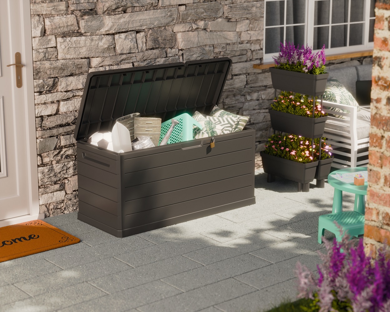 Il Baule da giardino è pratico, elegante, con un ampio spazio di stoccaggio, lucchettabile, resistente alle intemperie e impermeabile.