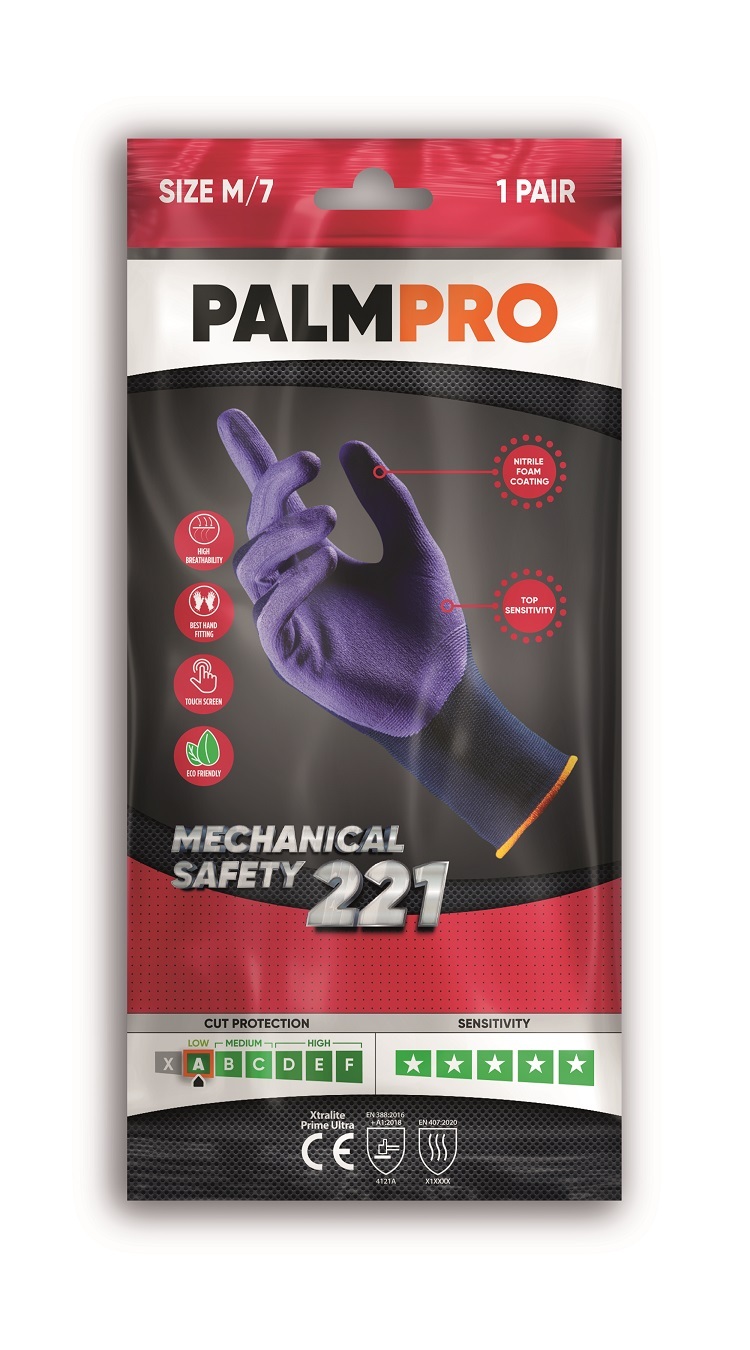 Il guanto Palmpro Mechanical safety 221, è il miglior candidato per lavori di precisione, poiché si caratterizza e garantisce: un’ottima sensibilità, grazie alla speciale maglina ultra sottile; un ottimo comfort; una buona protezione dal calore da contatto (100 °C per >/= 15 secondi); un’ottima traspirabilità.